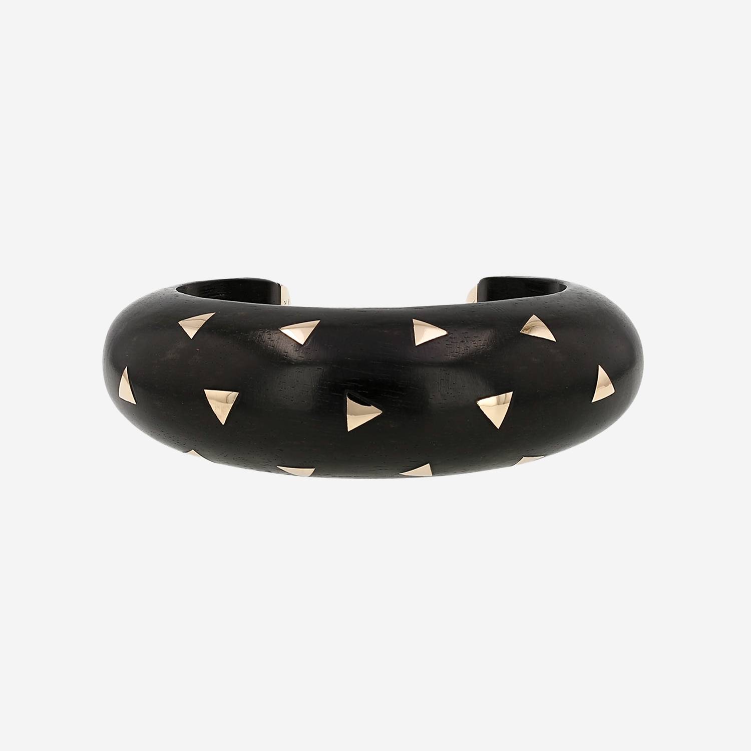 Brazalete redondo Van Cleef Arpels de oro amarillo y ébano, compuesto de un anillo abombado de ébano, adornado de motivos triangulares de oro amarillo.