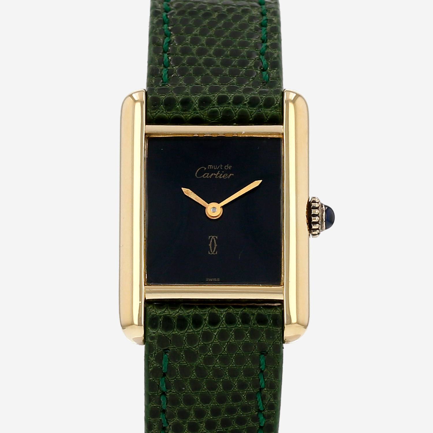 Reloj de pulsera Cartier Tank Must de plata dorada. Caja de reloj rectangular de plata dorada, fondo de caja enroscado, corona acanalada engastada con un cabujón zafiro.