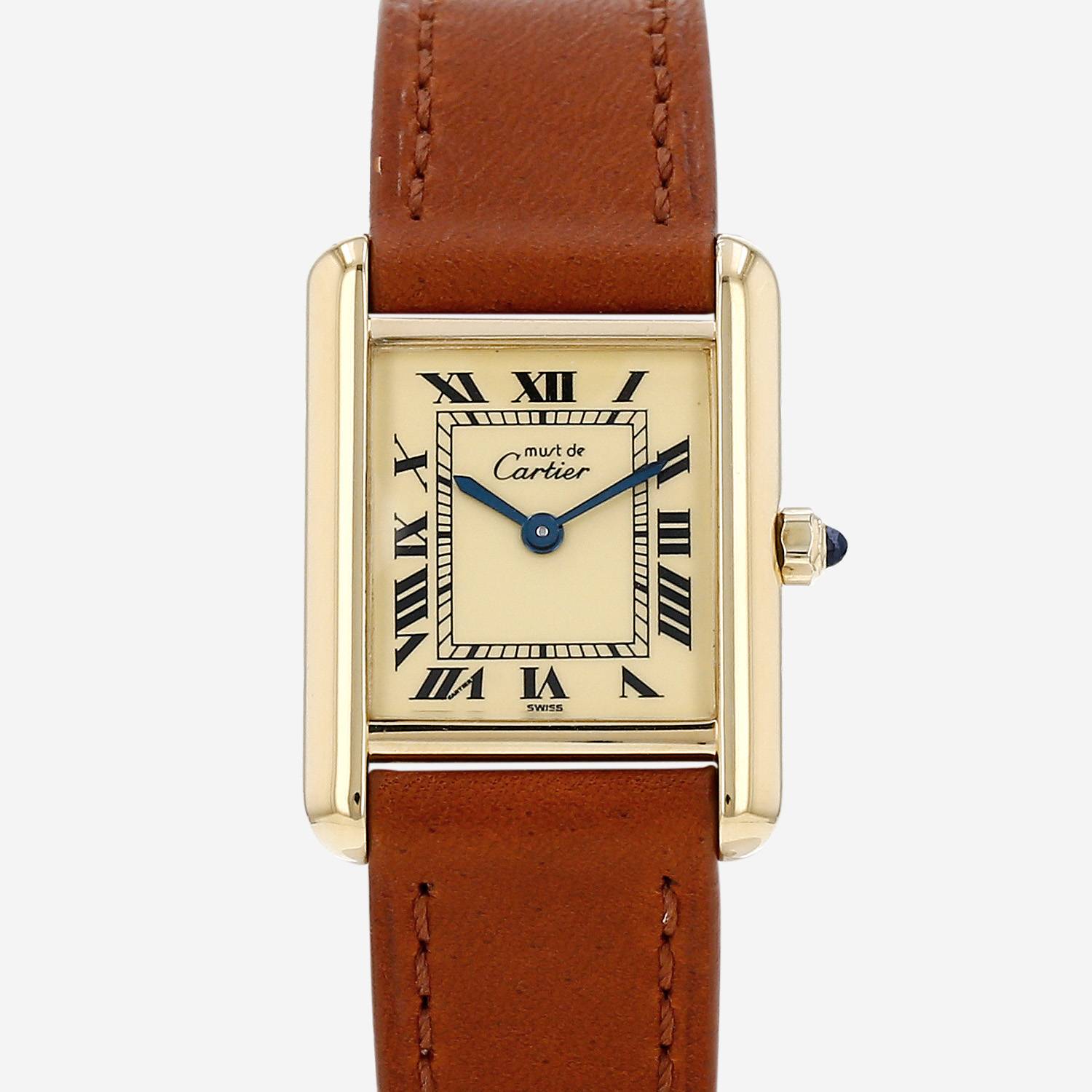 Reloj de pulsera Cartier Tank Must de plata dorada. Caja de reloj rectangular de plata dorada, fondo de caja enroscado, corona engastada con un cabujón zafiro.