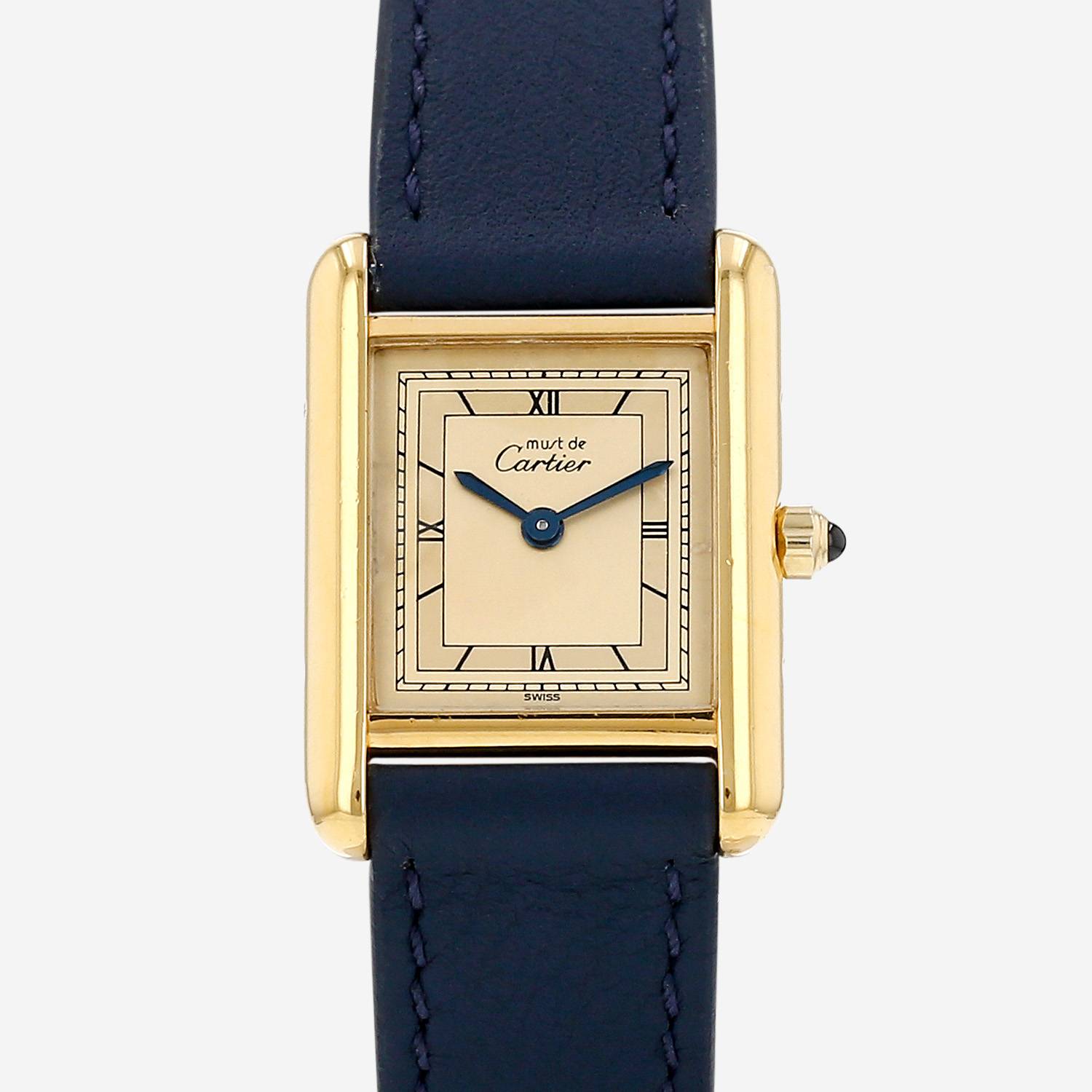 Reloj de pulsera Cartier Tank Must de plata dorada. Caja de reloj rectangular de plata dorada, fondo de caja enroscado, corona acanalada engastada con un cabujón zafiro.