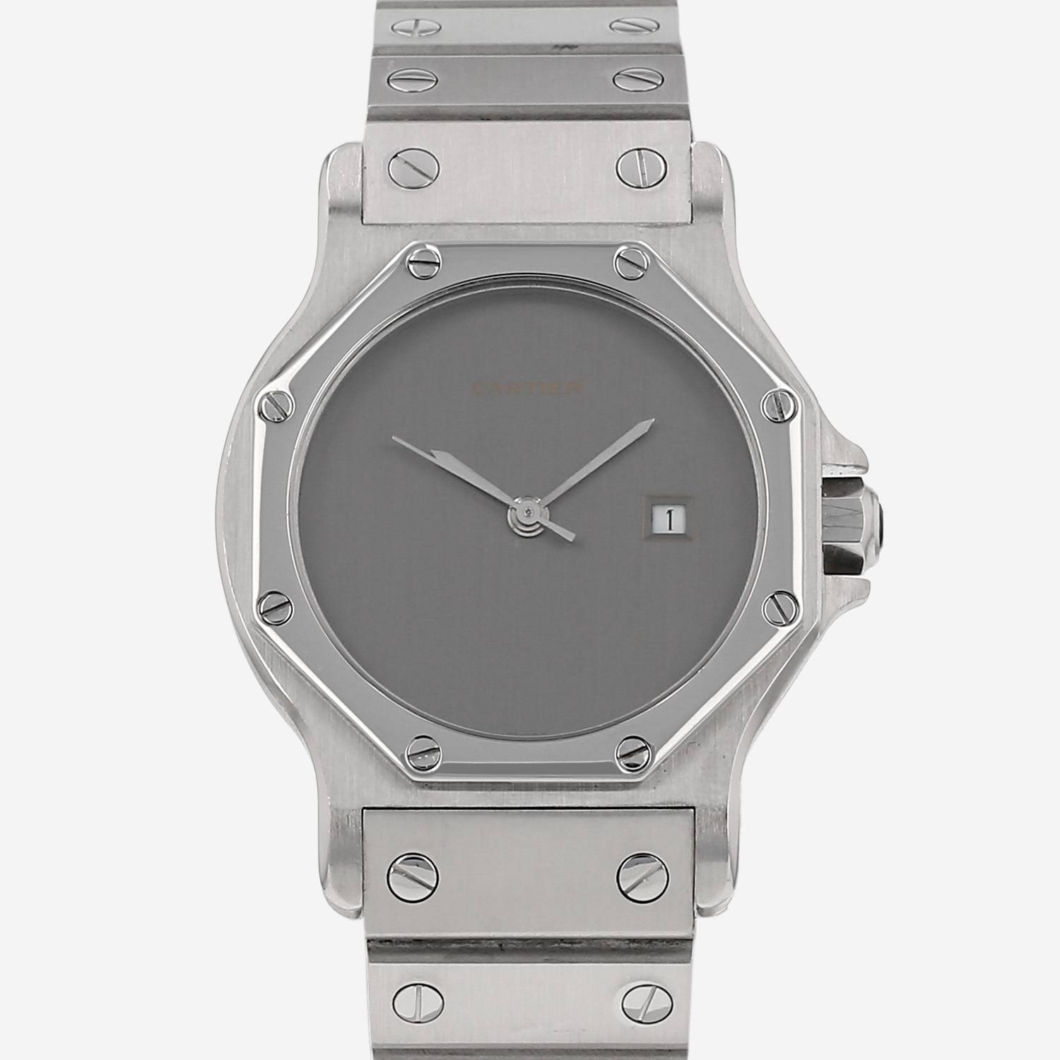 Reloj de pulsera Cartier Santos Octogonale de acero. Caja de reloj octogonal de acero, fondo de caja enroscado, bisel enroscado de acero, corona acanalada engastada con un cabujón zafiro.