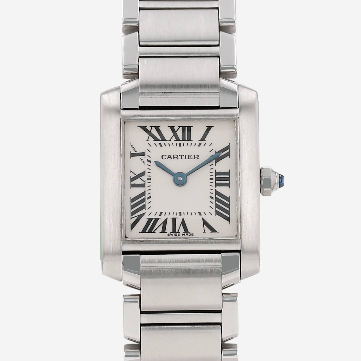 Reloj de pulsera Cartier Tank Française modelo pequeño de acero. Caja de reloj rectangular de acero, fondo de caja enroscado, corona acanalada engastada con un cabujón zafiro.