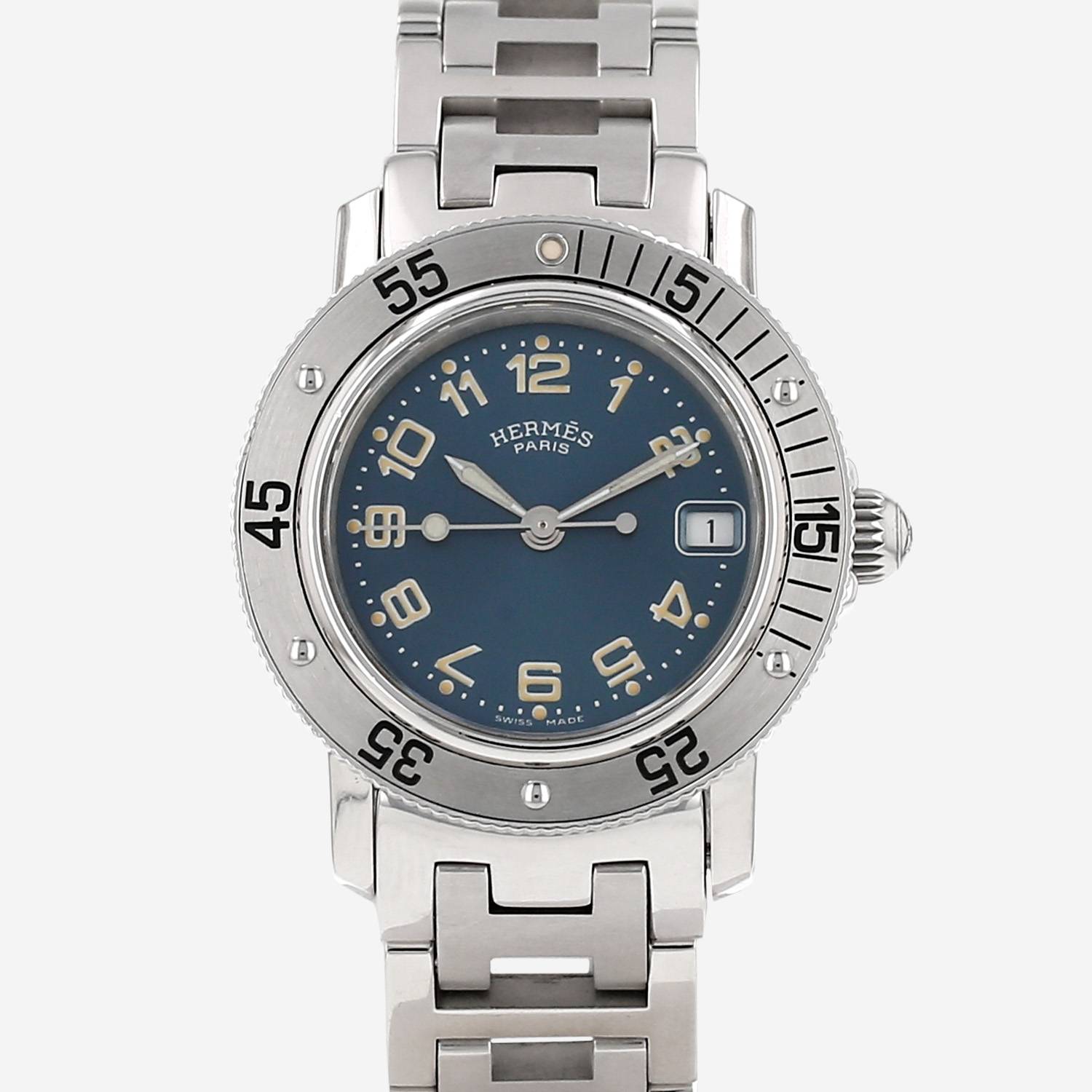 Reloj de pulsera Hermès Clipper de acero. Caja de reloj redonda de acero, fondo de caja enroscado, bisel graduado giratorio unidireccional, corona enroscada.