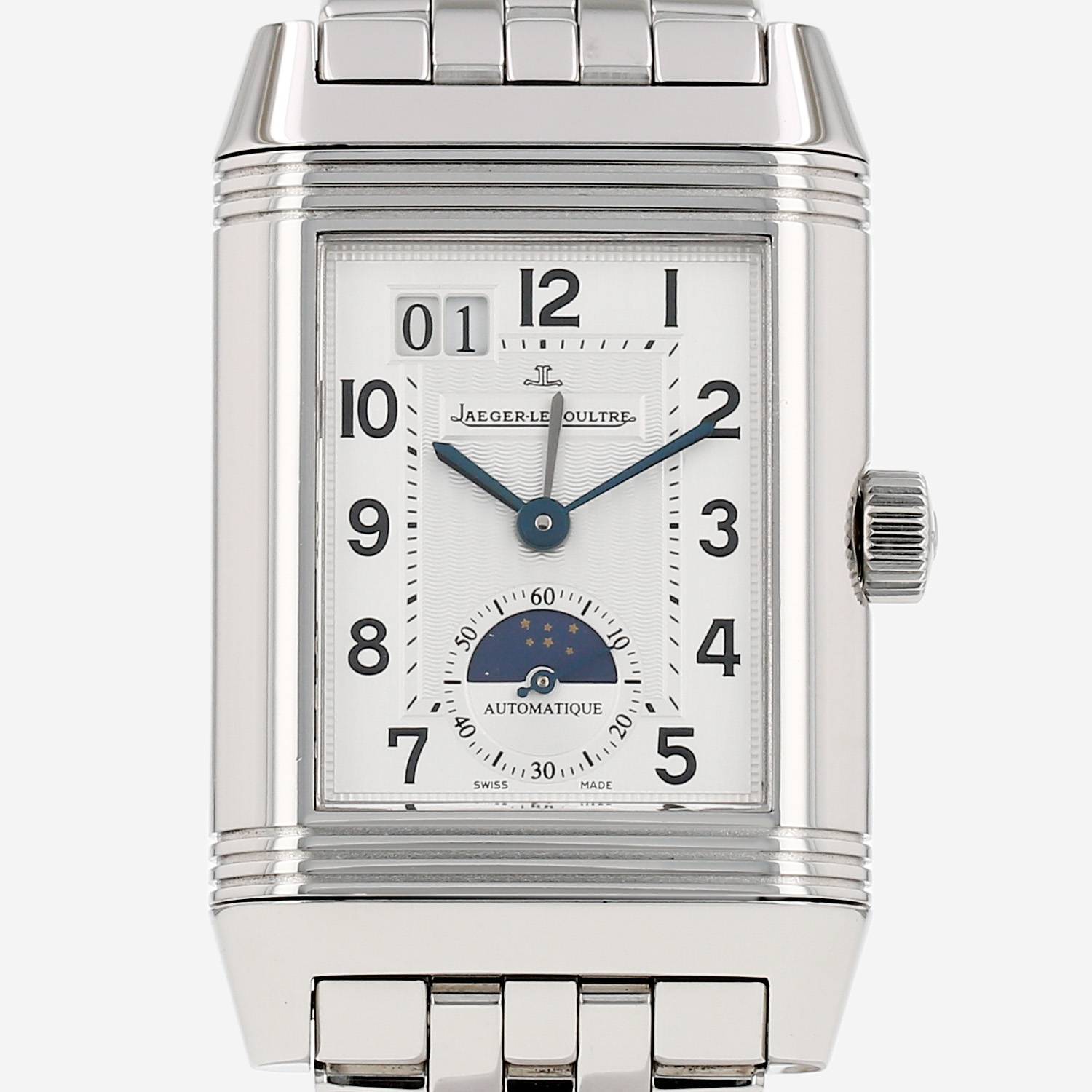 Reloj de pulsera Jaeger-LeCoultre Reverso de acero. Caja de reloj rectangular de acero reversible triplemente gallonada, fondo de caja enroscado, corona acanalada.