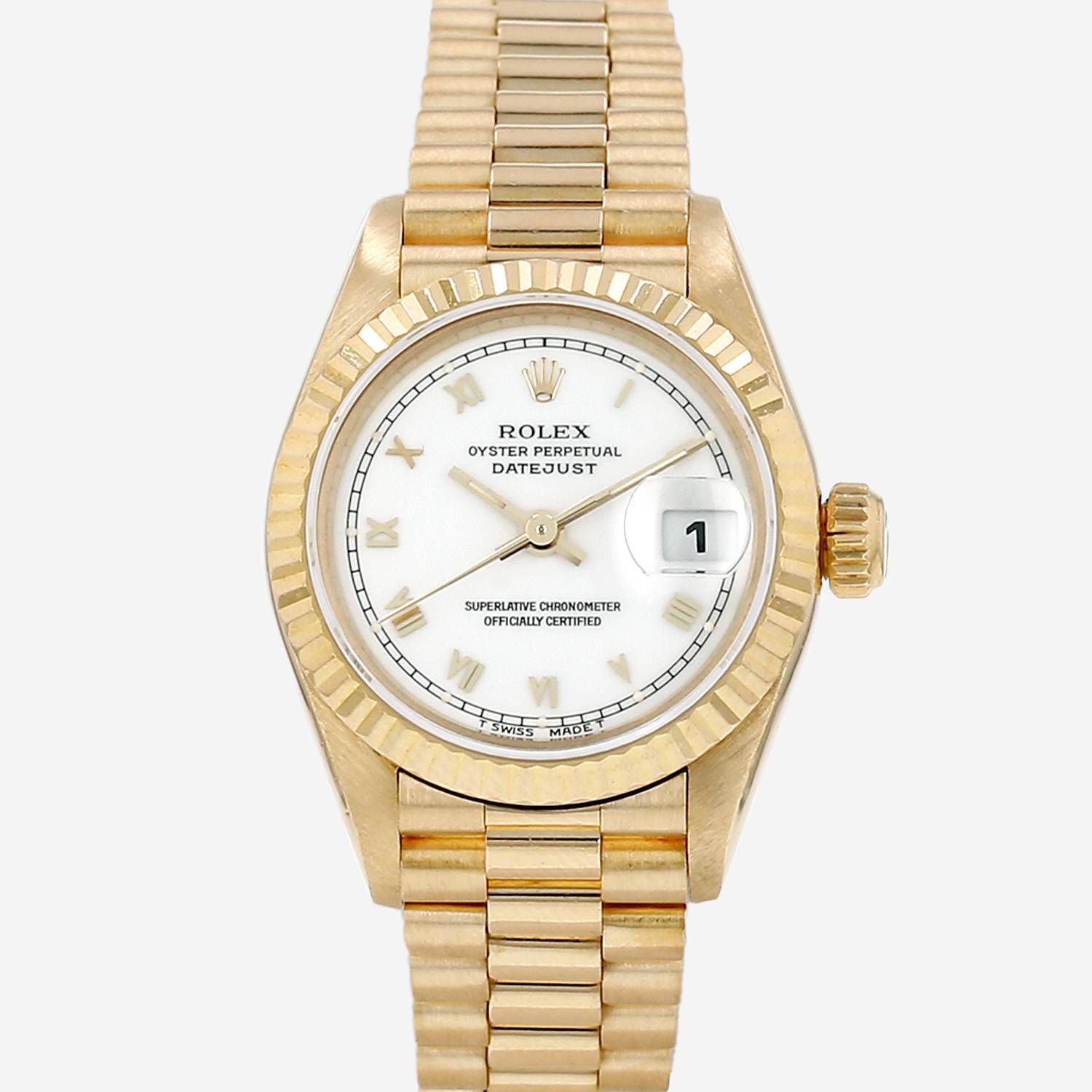 Reloj de pulsera Rolex Datejust Lady de oro amarillo. Caja de reloj redonda de oro amarillo, fondo de caja enroscado, bisel estriado de oro amarillo, corona enroscada.