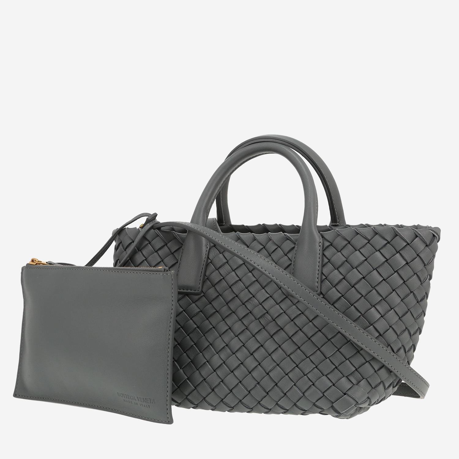 Incantevole shopping bag Bottega Veneta Cabat modello piccolo in pelle intrecciata grigio, inserti in metallo dorato, doppio manico in pelle grigia, una tracolla removibile in pelle grigia da portare a mano, in spalla o a tracolla.