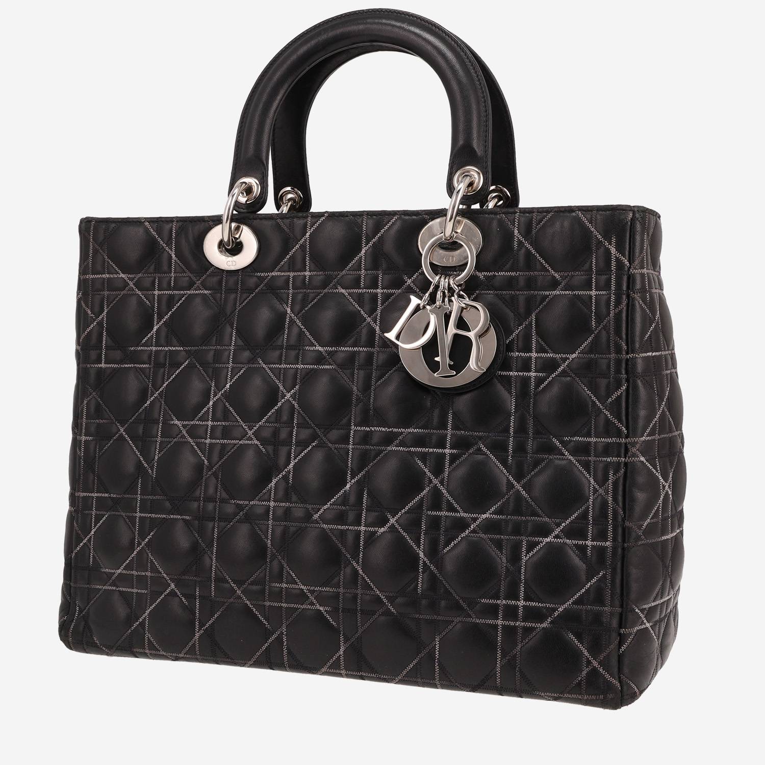 Inimitabile borsa Dior Lady Dior in pelle nero, inserti in metallo argentato, doppio manico in pelle nera da portare a mano.