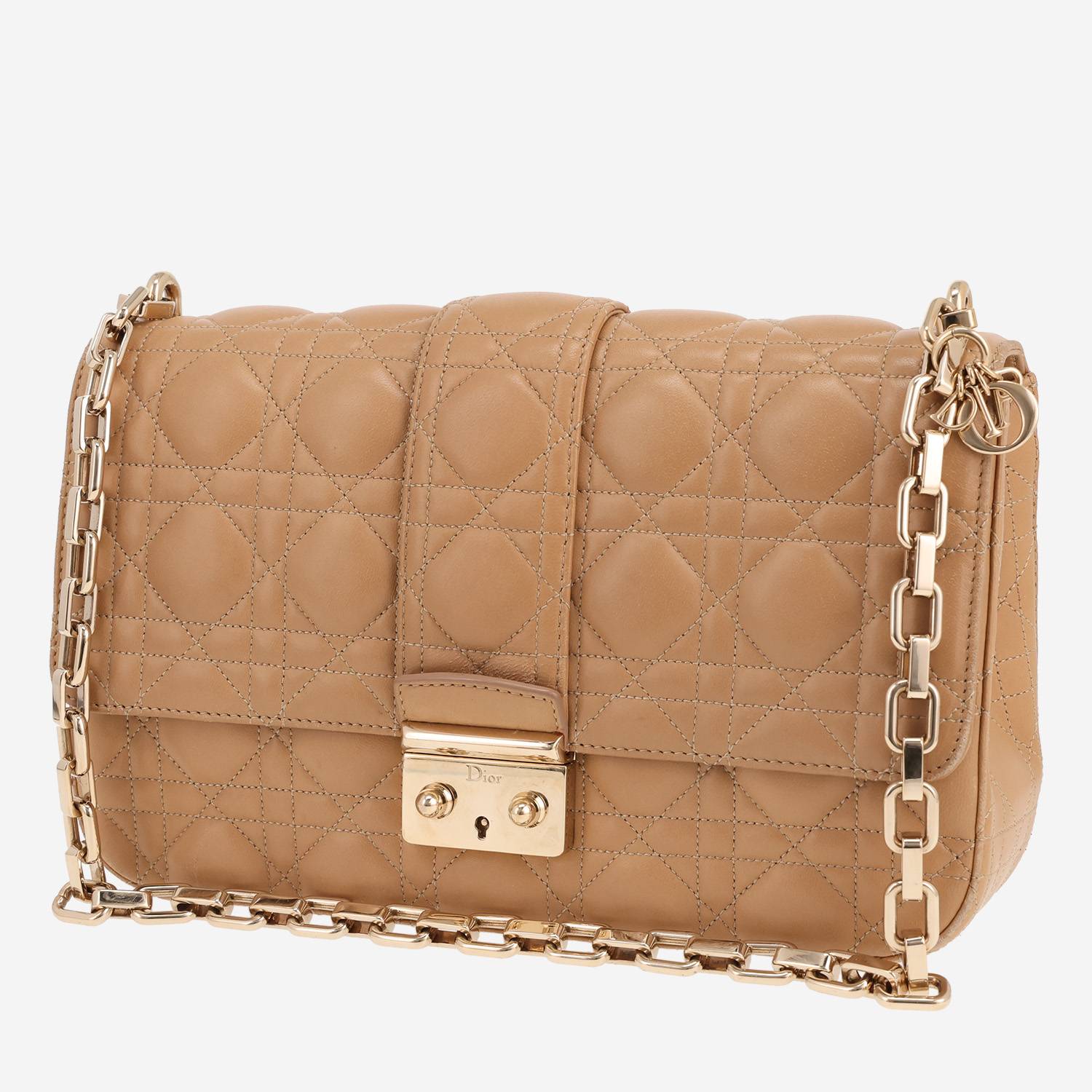 Elegante borsa Dior Promenade in pelle cannage beige, inserti in metallo dorato, una tracolla a catena in metallo dorato da portare a mano, in spalla o a tracolla.