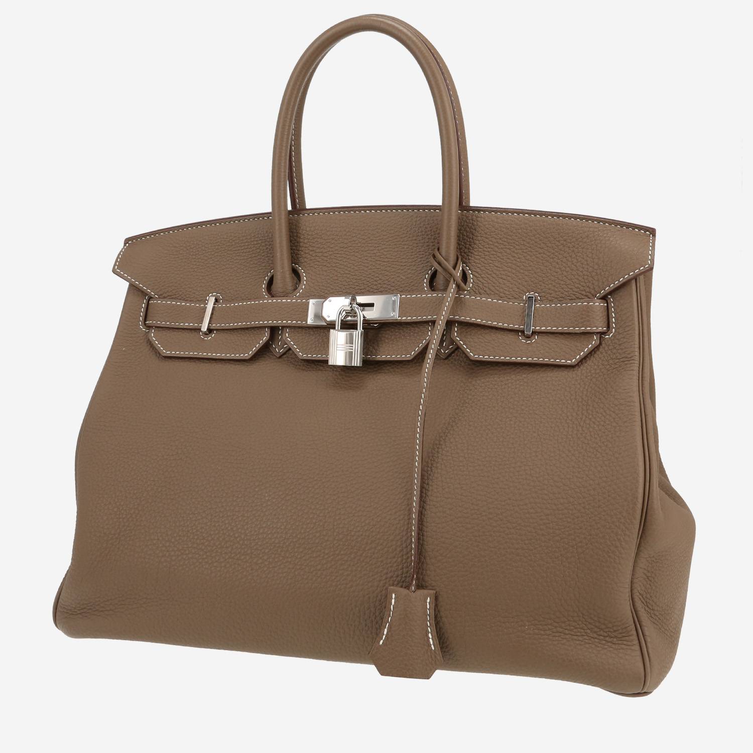 Magnifica borsa Hermès Birkin 35 cm in pelle togo etoupe, inserti in palladio, doppio manico in pelle etoupe da portare a mano.