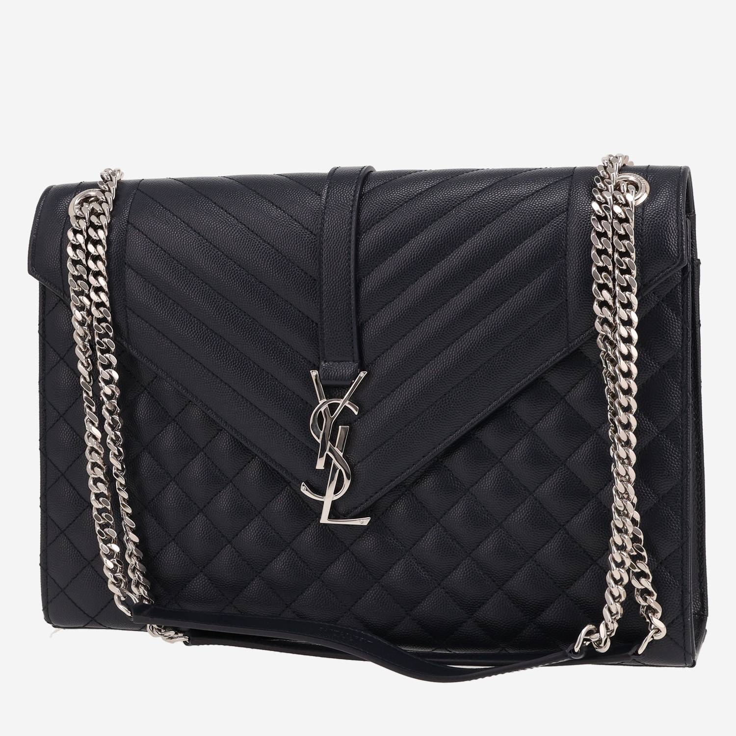 Magnifica borsa Saint Laurent Envelope in pelle martellata e trapuntata blu marino, inserti in metallo argentato, doppia tracolla a catena trasformabile in metallo argentato da portare a mano, in spalla o a tracolla.