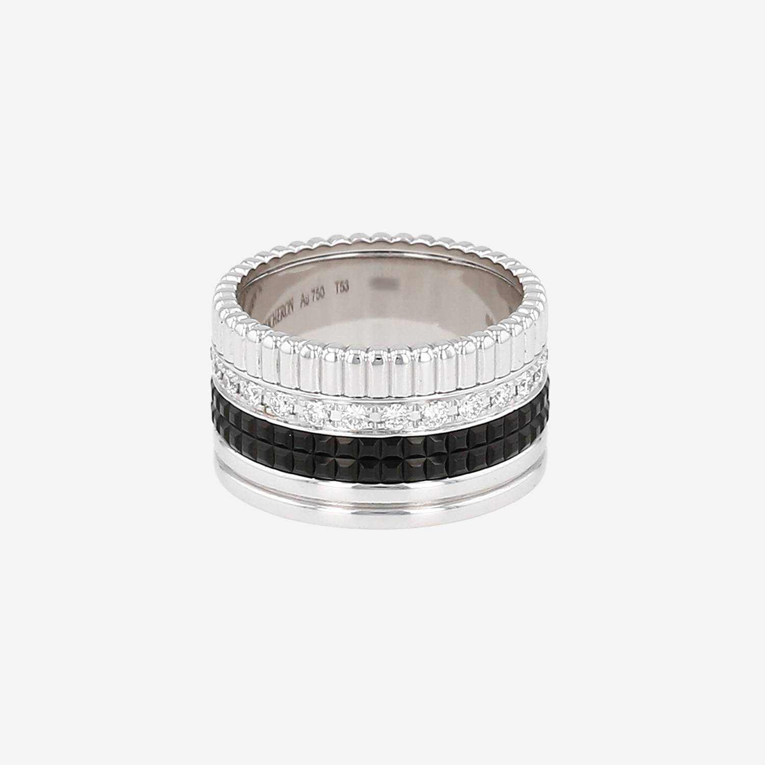 Anello Boucheron Quatre Black Edition modello grande in oro bianco, in diamanti, e PVD nero, composto da un montatura liscia in oro bianco, da un montatura in oro bianco delicatamente incastonata di diamanti arricchita da un montatura testurizzata in PVD nero, da un montatura godronata in oro bianco.