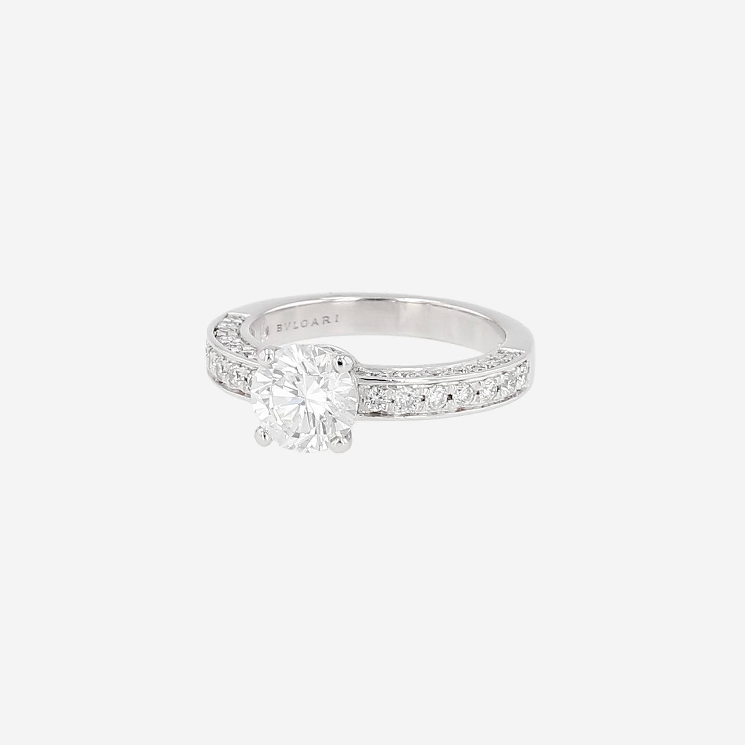Anello solitario Bulgari in platino e diamanti, composto da un bella montatura in platino, che sostengono al centro un magnifico diamante con taglio a brillante del peso totale 1.13 carati, circondato sulla montatura da un elegante pavé in diamanti con taglio a brillante circa 0.40 carati.