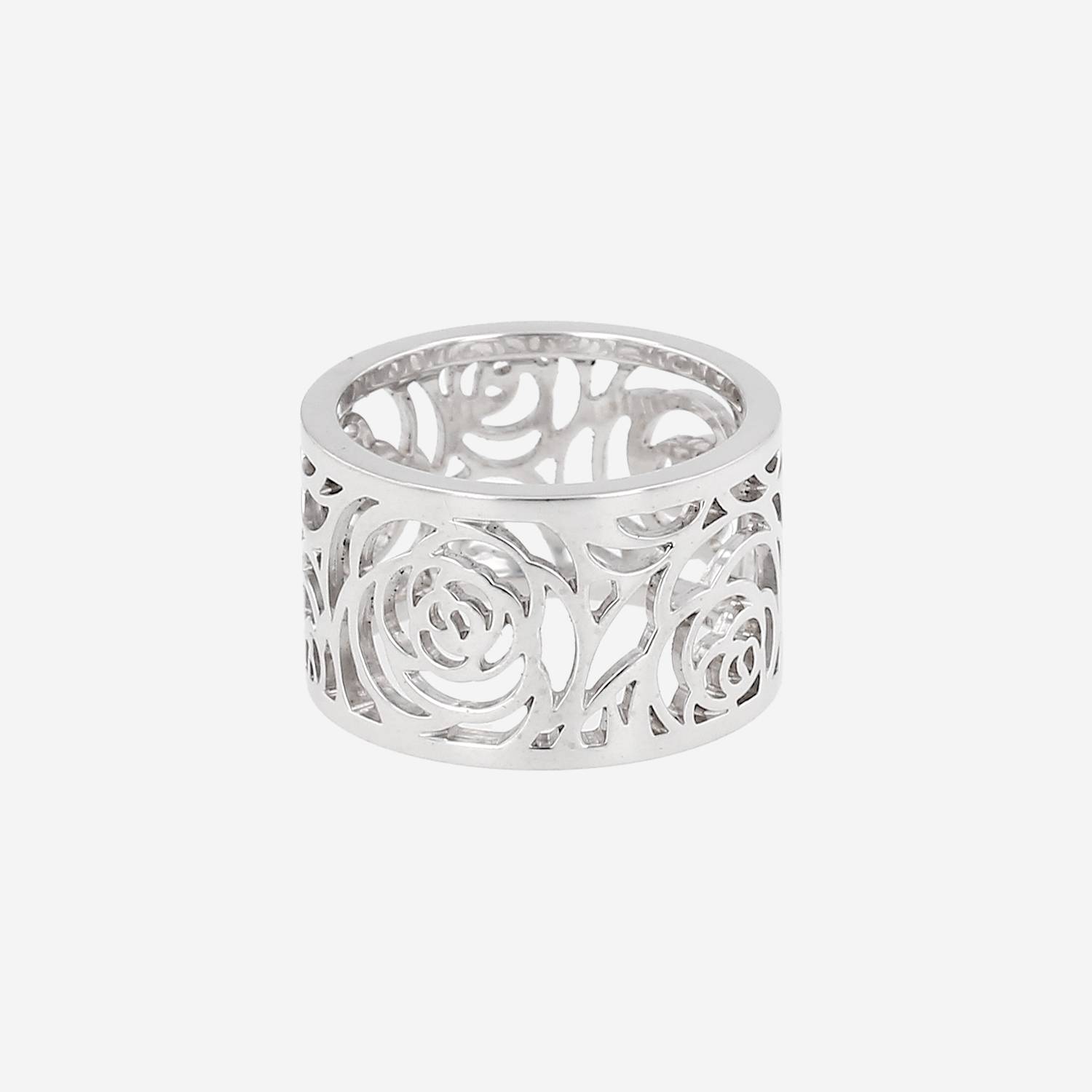 Anello Chanel Camélia Fil modello grande in oro bianco, composto da un elegante fascia traforata in oro bianco.