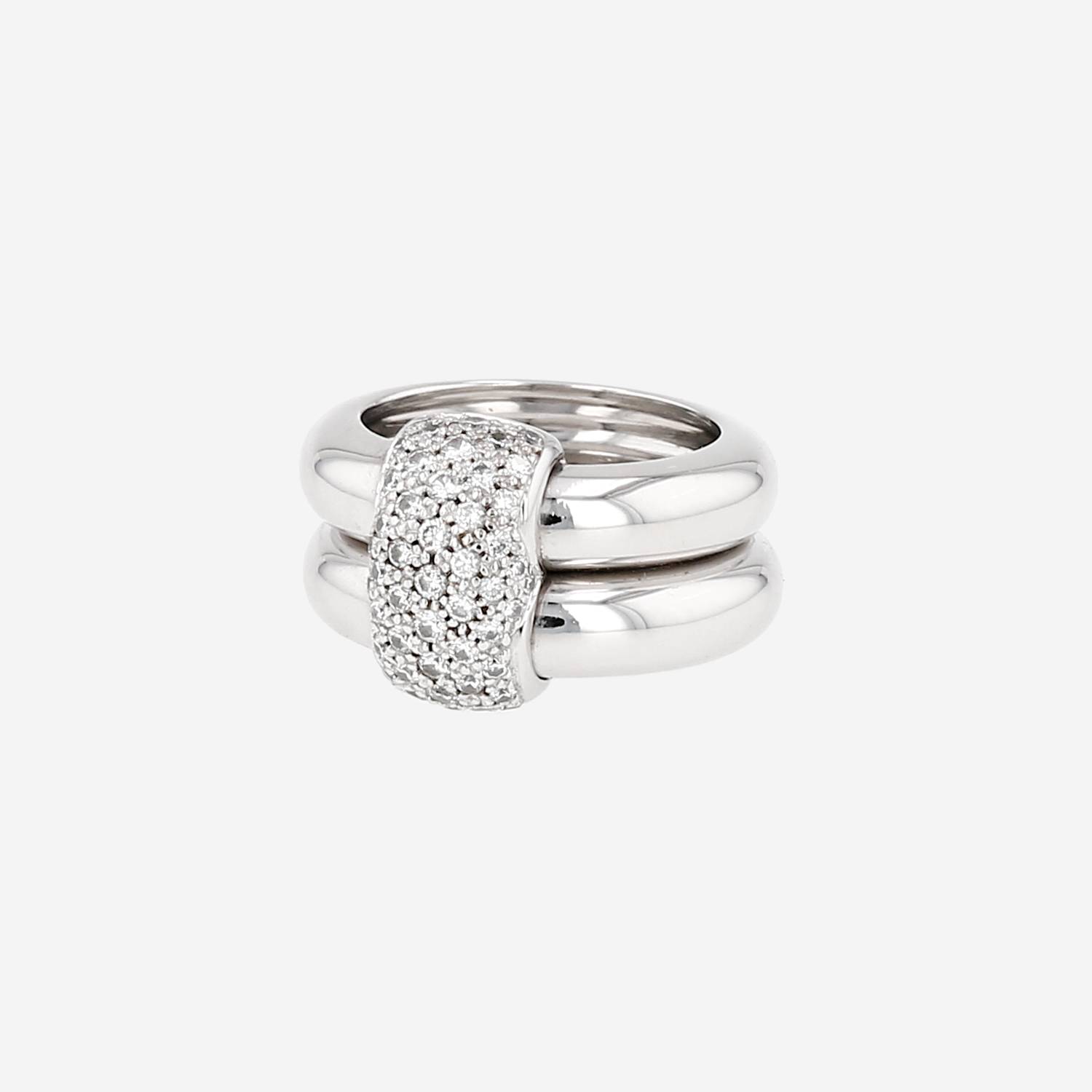 Anello Chaumet Duo in oro bianco e diamanti, composto da un motivo bombato in oro bianco finemente incastonato di diamanti con taglio a brillante 0.40 carati di circa, che sostengono belle montature bombate semi-mobili in oro bianco.