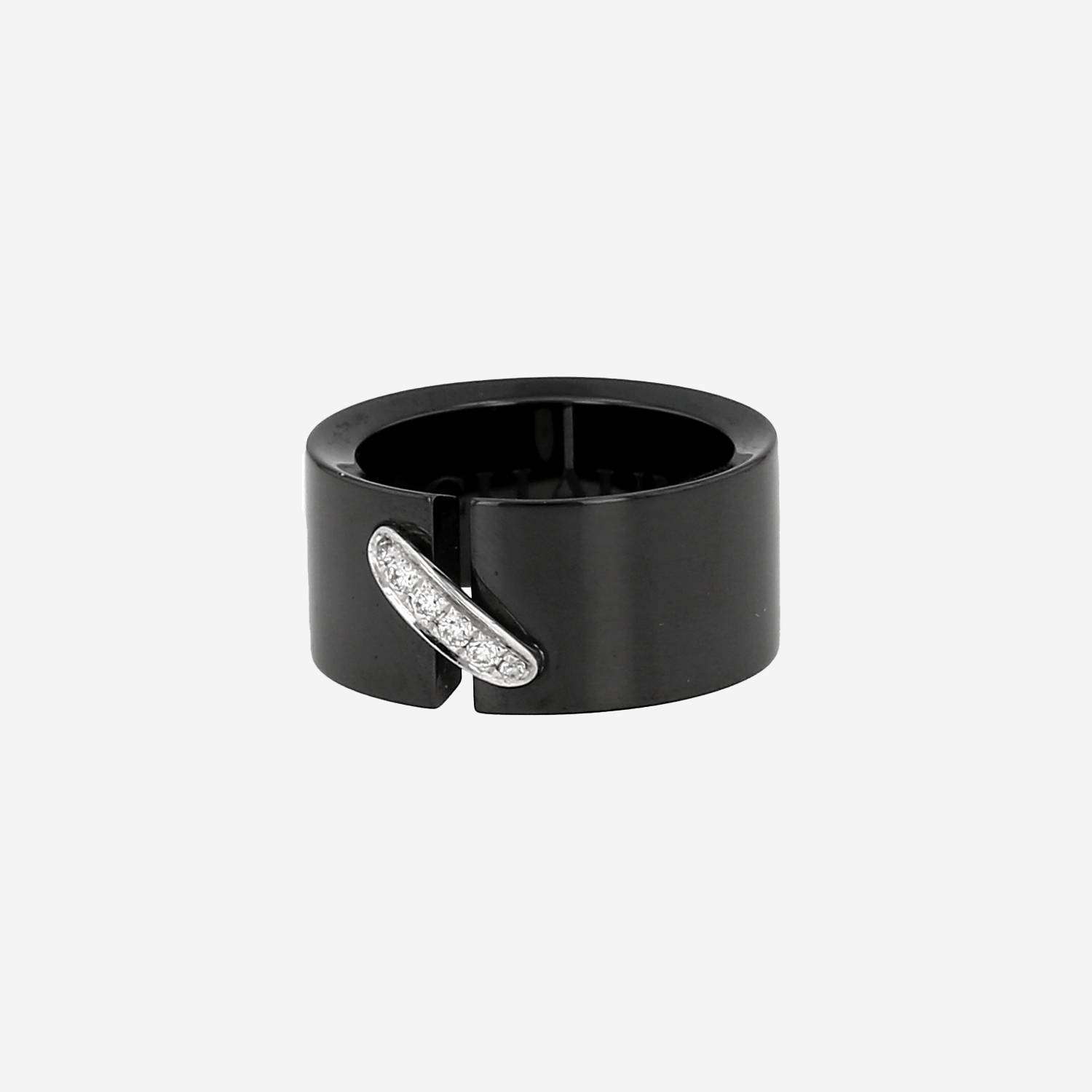 Anello Chaumet Lien modello medio in oro bianco, in ceramica nera, e diamanti, composto da un elegante fascia liscia in ceramica nera, ornato al centro da un sottile elemento di giunzione bombato in oro bianco delicatamente incastonato di diamanti con taglio a brillante.