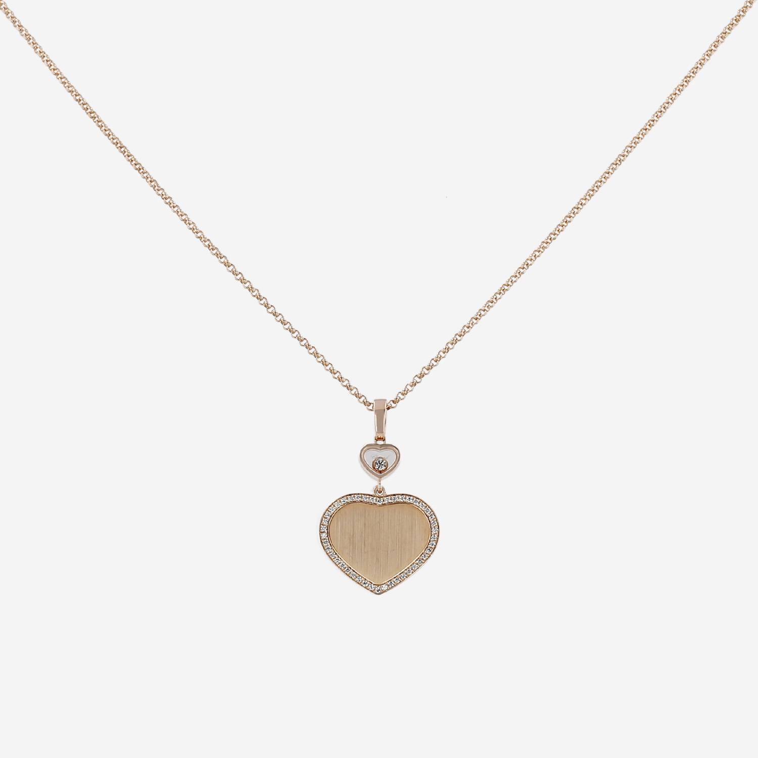 Collana Chopard Happy Hearts in oro rosa e diamanti, composta da un elegante cuore in oro rosa parzialmente tempestato di diamanti con taglio a brillante di circa 0.45 carati in totale, ornata sulla parte superiore da un diamante mobile con taglio a brillante del peso circa 0.03 carati, il tutto sostenuto da una sottile catena in oro rosa.