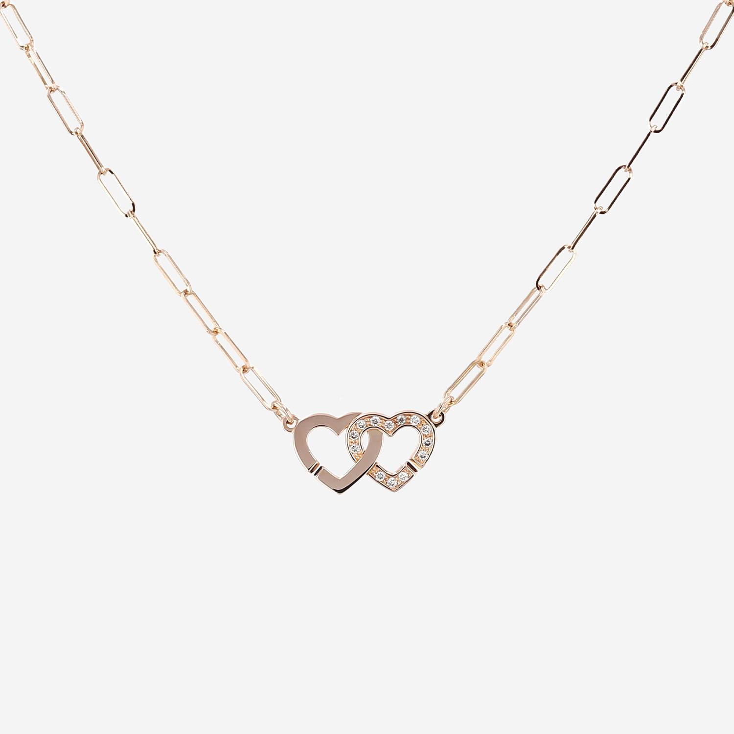 Collana Dinh Van Double Coeurs in oro rosa e diamanti, composta di cuori intrecciati in oro rosa parzialmente di diamanti con taglio a brillante, il tutto sostenuto da una catena in oro rosa.