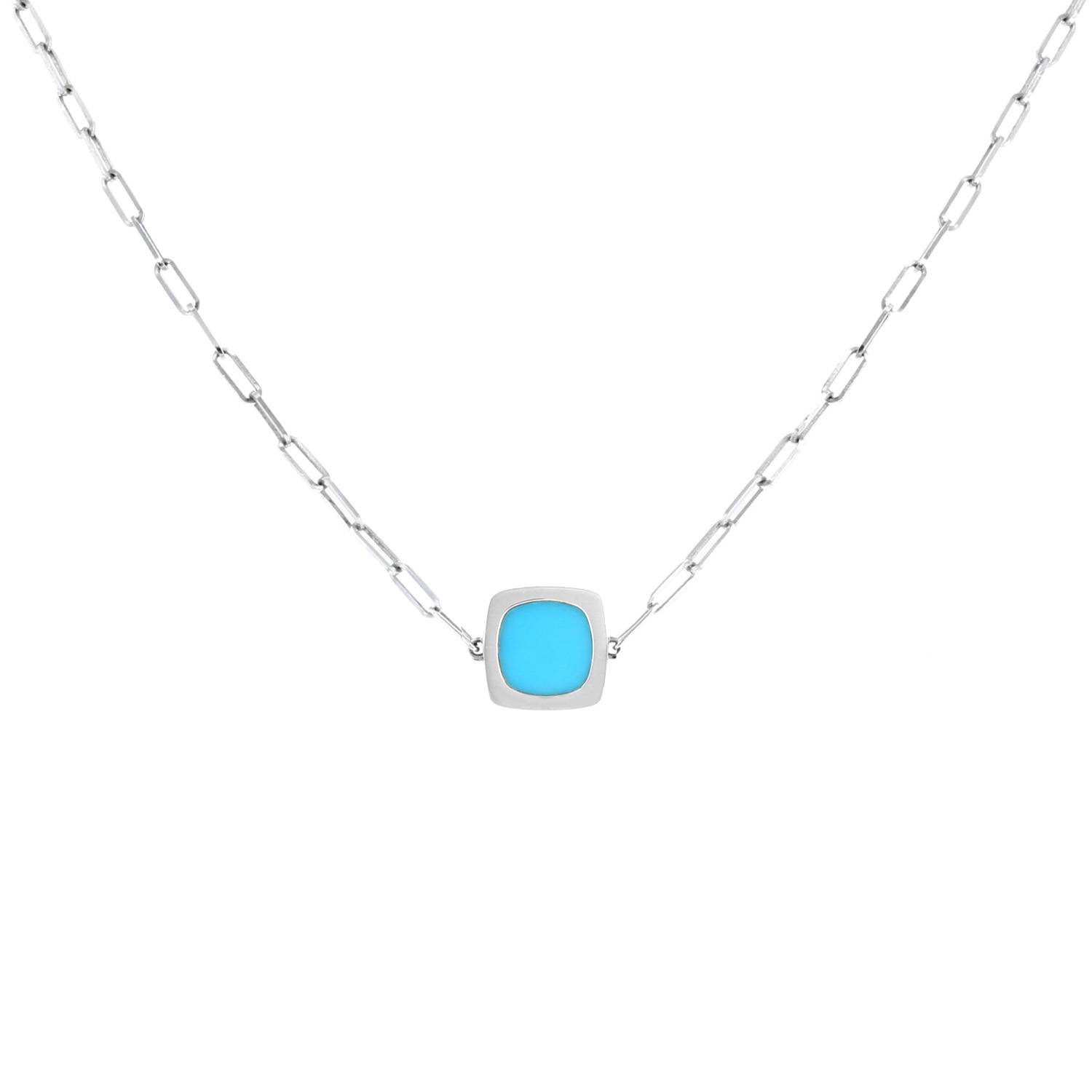 Collana Dinh Van Impressions in oro bianco e turchese, composta da un elegante motivo quadrato in oro bianco, ornata da una placca in turchese, arricchita da una bella catena a maglie ovale.
