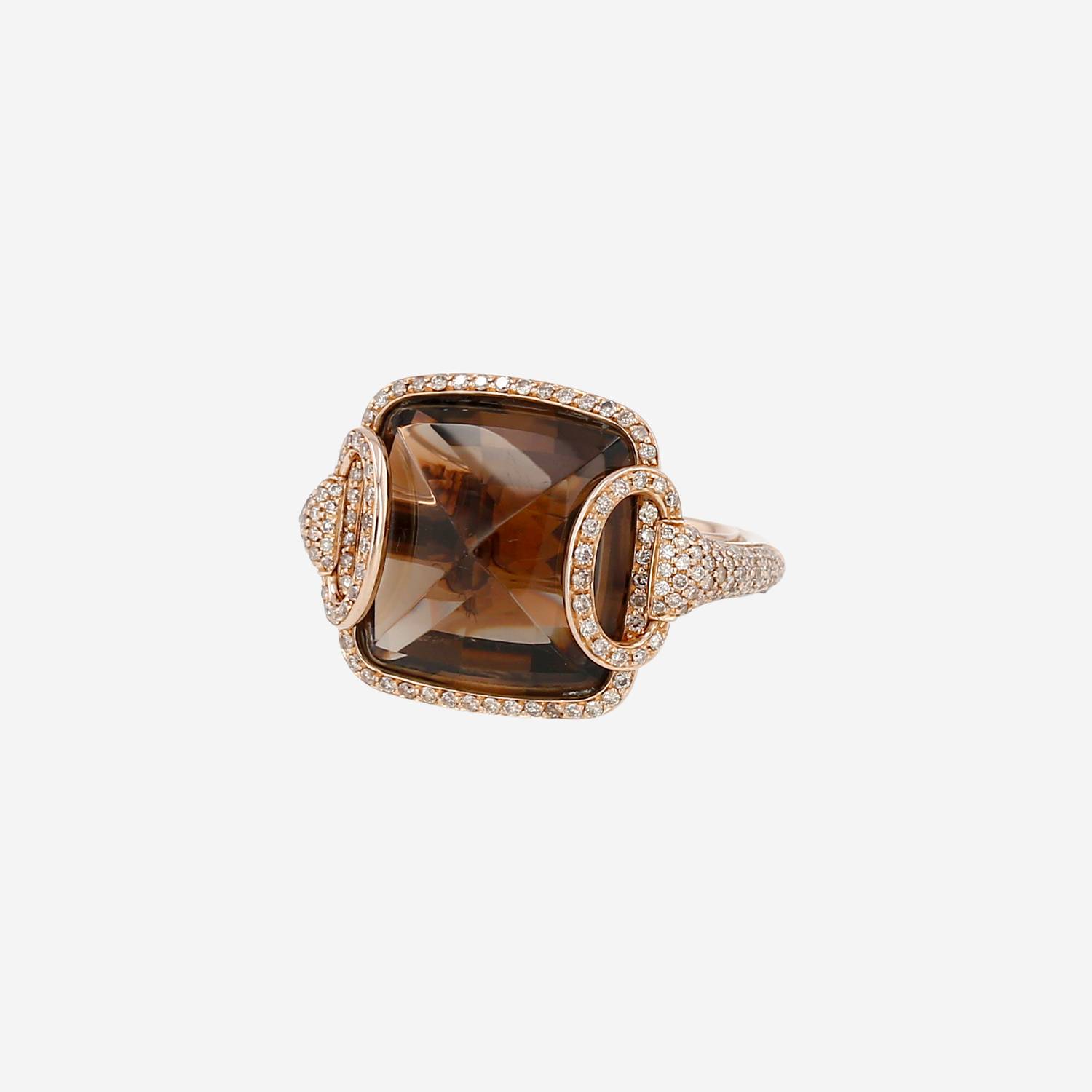 Anello Hermès Nausica in oro rosa, in diamanti, e quarzo fumé, composto da una importante in oro rosa elegantemente tempestato di diamanti con taglio a brillante di circa 1.90 carati in totale, ornato al centro da un splendido quarzo fumé di taglio quadrato del peso circa 14 carati.