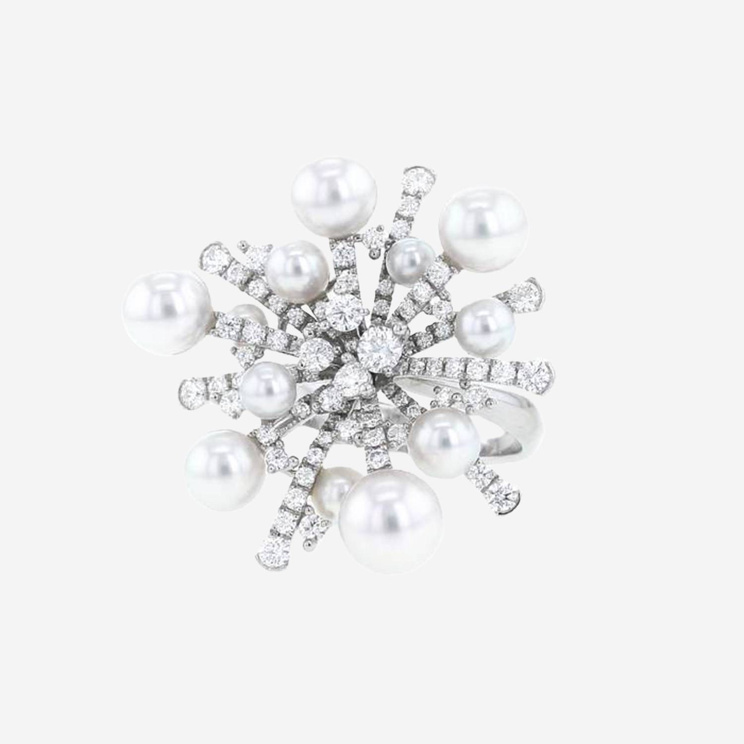Bellissimo anello Mikimoto A World of Creativity in oro bianco, perle coltivati di Akoya e diamanti, con un fiocco di neve elegantemente tempestato di diamanti con taglio a brillante da 1.49 carati totale, arricchito da perle coltivati di Akoya.