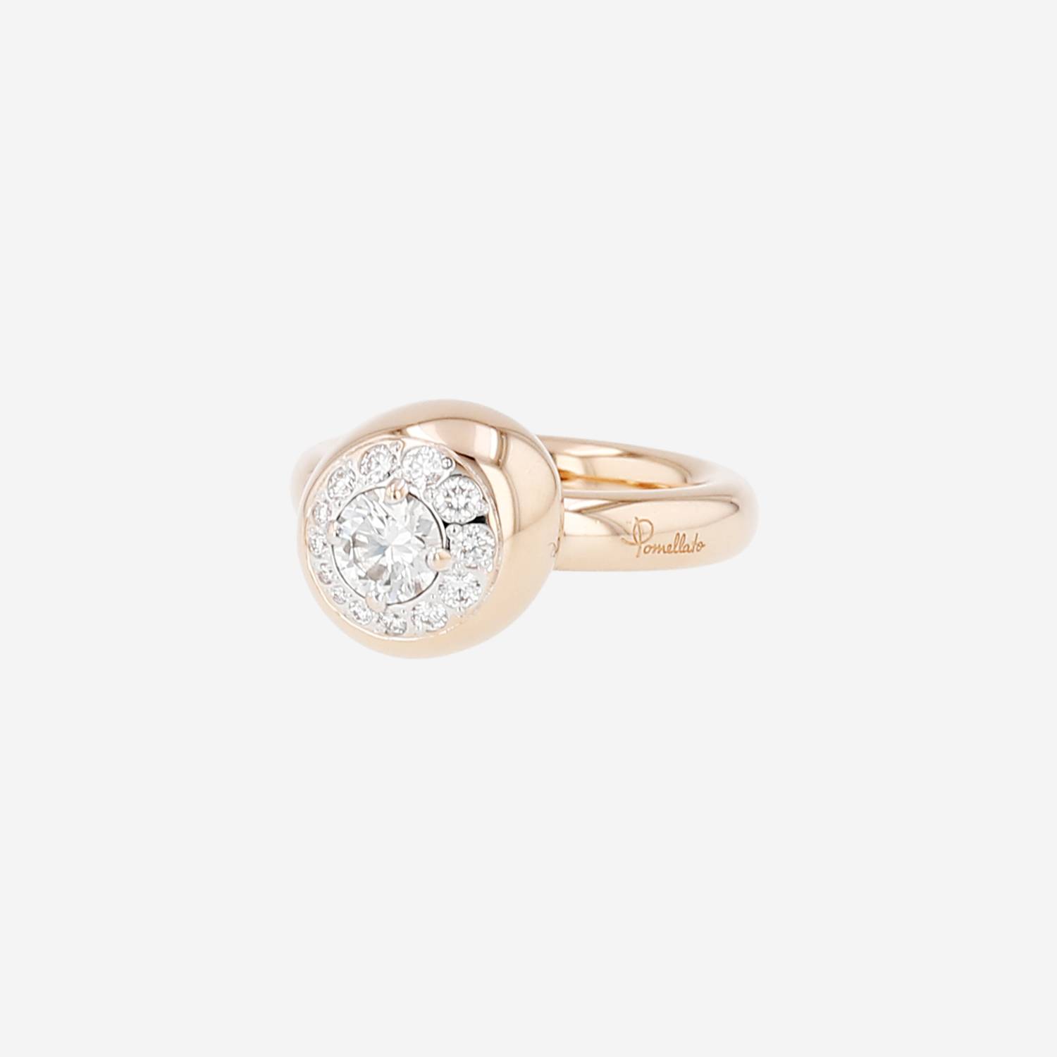 Anello Pomellato in oro rosa, in oro bianco, e diamanti, composto da un bella montatura in oro rosa, ornato da un motivo bombato in oro rosa finemente tempestato di diamanti con taglio a brillante arricchito da un in diamante con taglio a brillante.