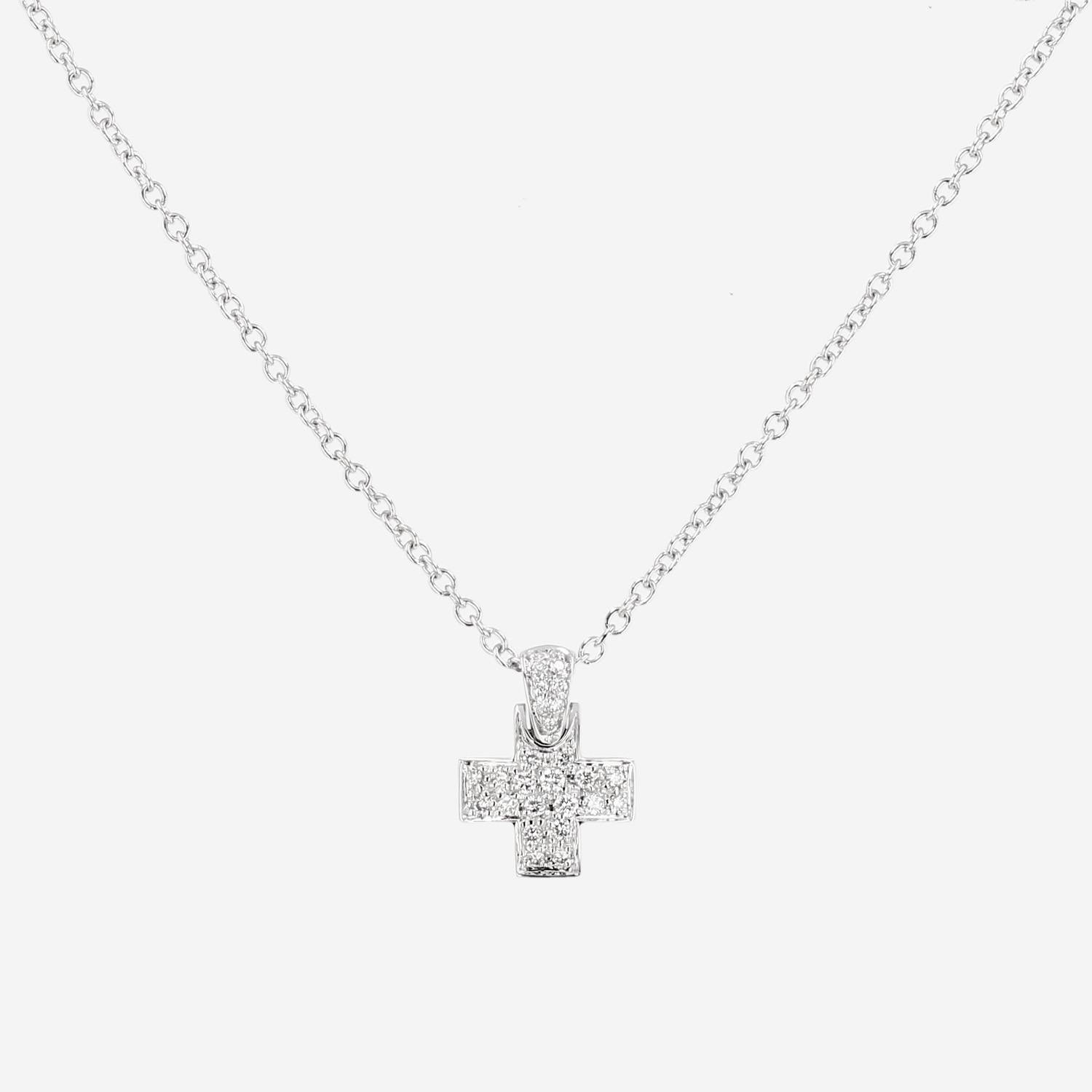 Ciondolo Pomellato in oro bianco e diamanti, dotato di una bellissima croce in oro bianco finemente incastonata di diamanti con taglio a brillante 0.20 carati di circa, il tutto sostenuto da una catena in oro bianco.