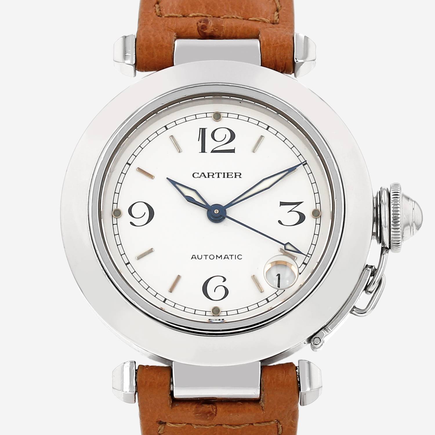 Orologio da polso Cartier Pasha in acciaio. Cassa rotonda in acciaio, fondo cassa avvitato, lunetta liscia, proteggi-corona a vite.
