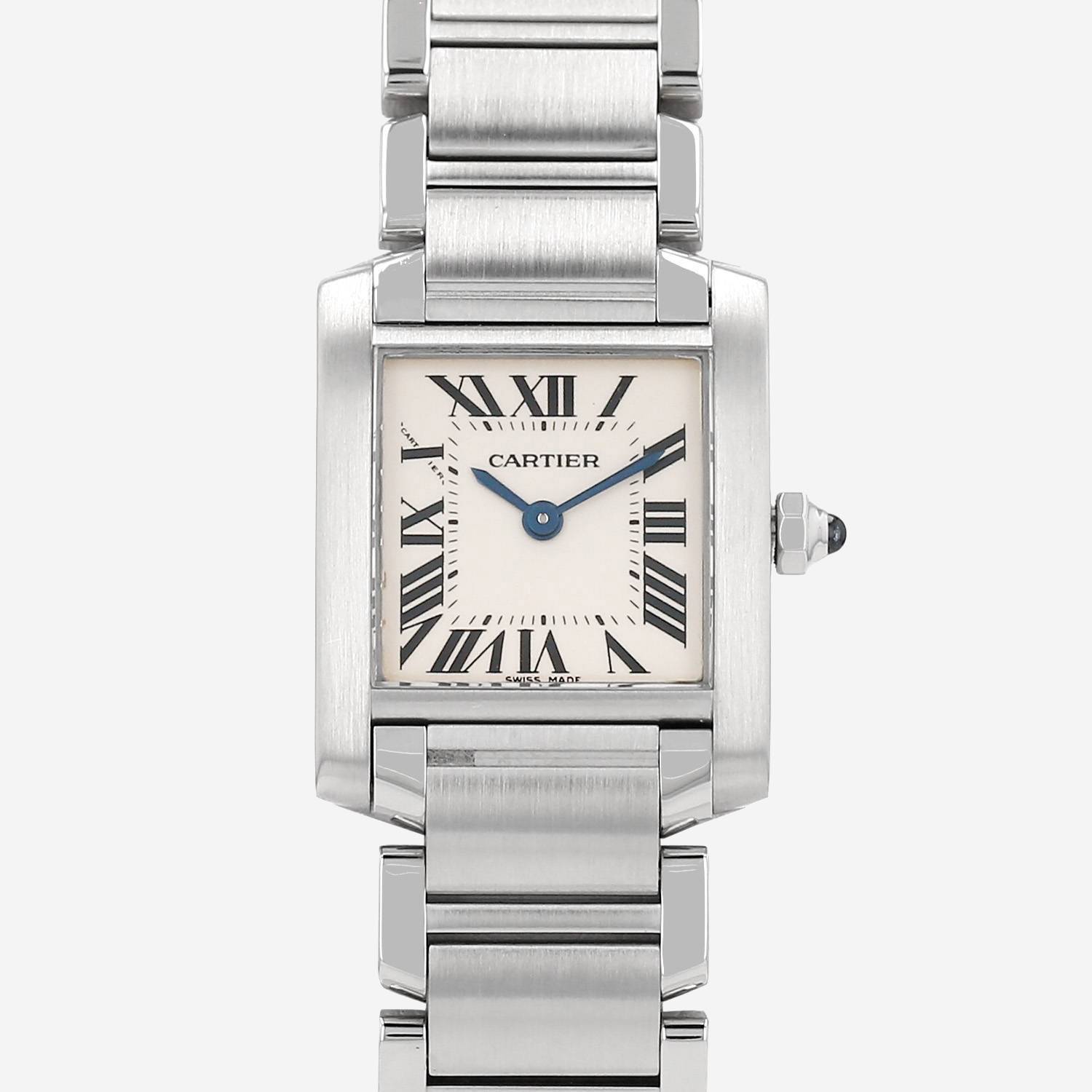 Orologio da polso Cartier Tank Française in acciaio. Cassa rettangolare in acciaio, fondo cassa avvitato, corona incastonata con un cabochon in zaffiro.