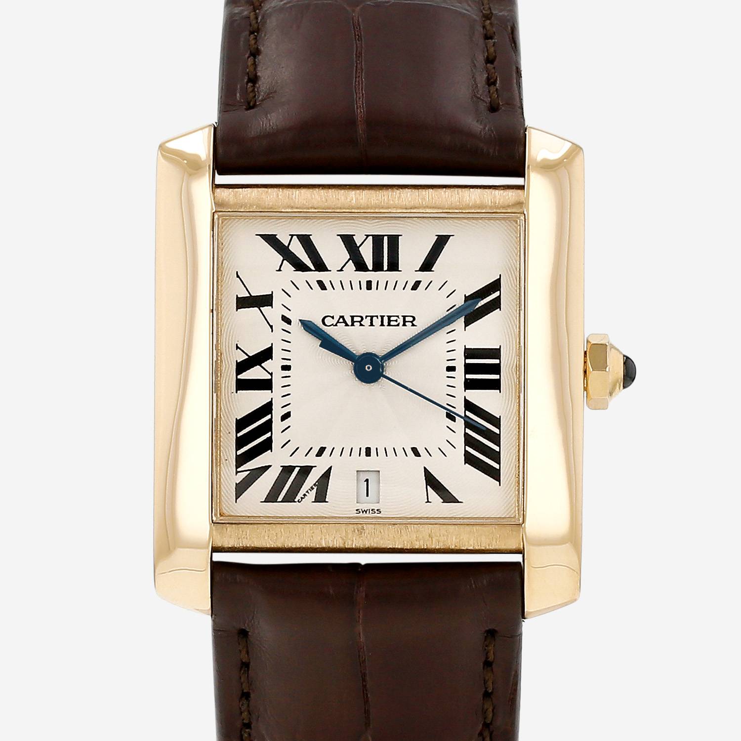 Orologio da polso Cartier Tank Française in oro giallo. Cassa rettangolare in oro giallo, fondo cassa avvitato, corona scanalata incastonata con un cabochon in zaffiro.