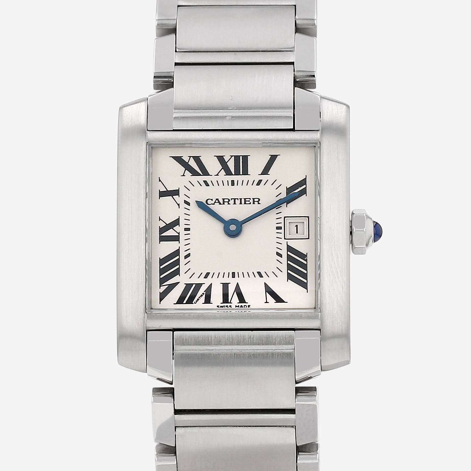 Orologio da polso Cartier Tank Française modello medio in acciaio. Cassa rettangolare in acciaio, fondo cassa avvitato, corona scanalata incastonata con un cabochon in zaffiro.