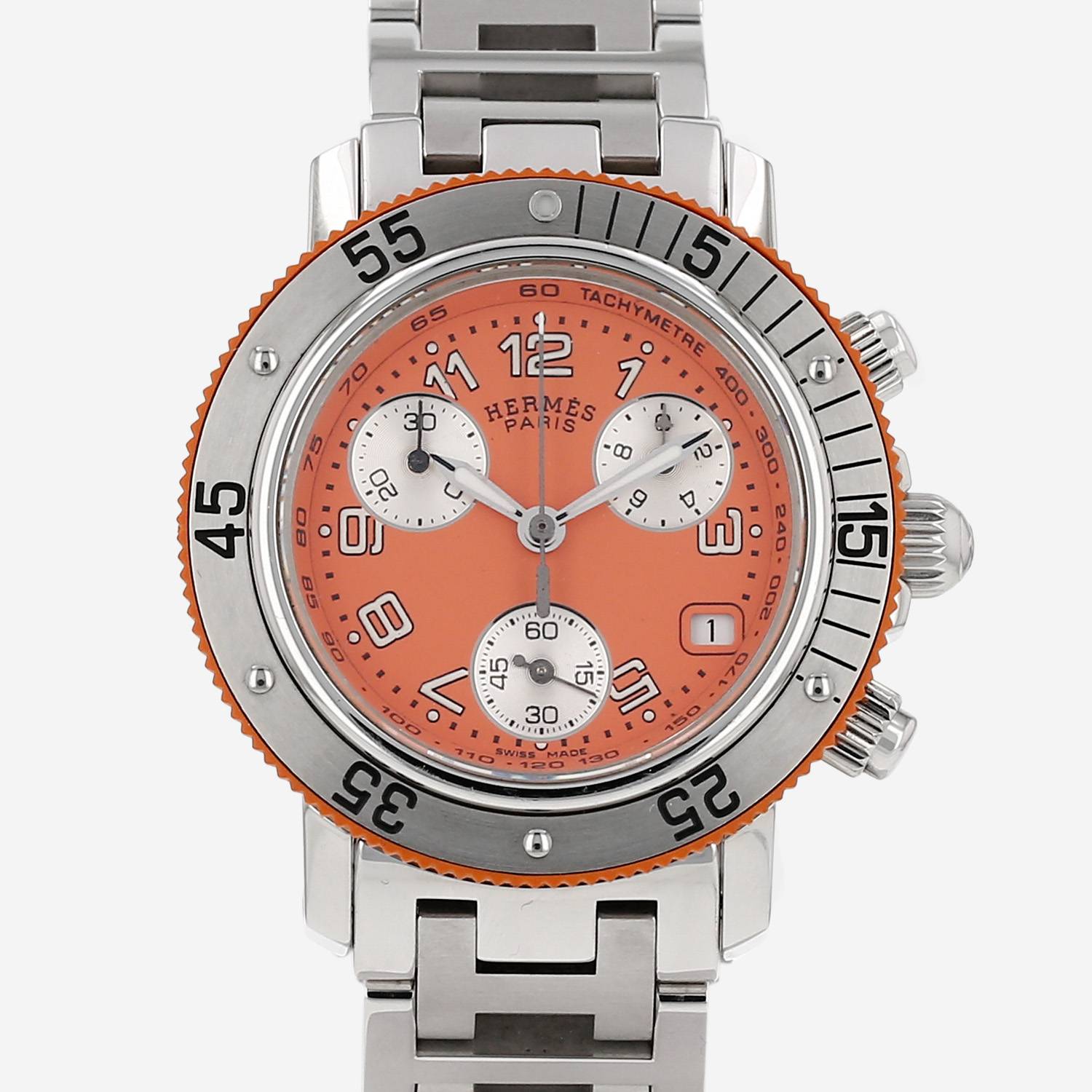 Orologio da polso Hermès Clipper Chrono in acciaio. Cassa rotonda in acciaio, fondo cassa avvitato, pulsanti a pompa, alle 2 e alle 4, lunetta graduata girevole monodirezionale in acciaio, corona scanalata.