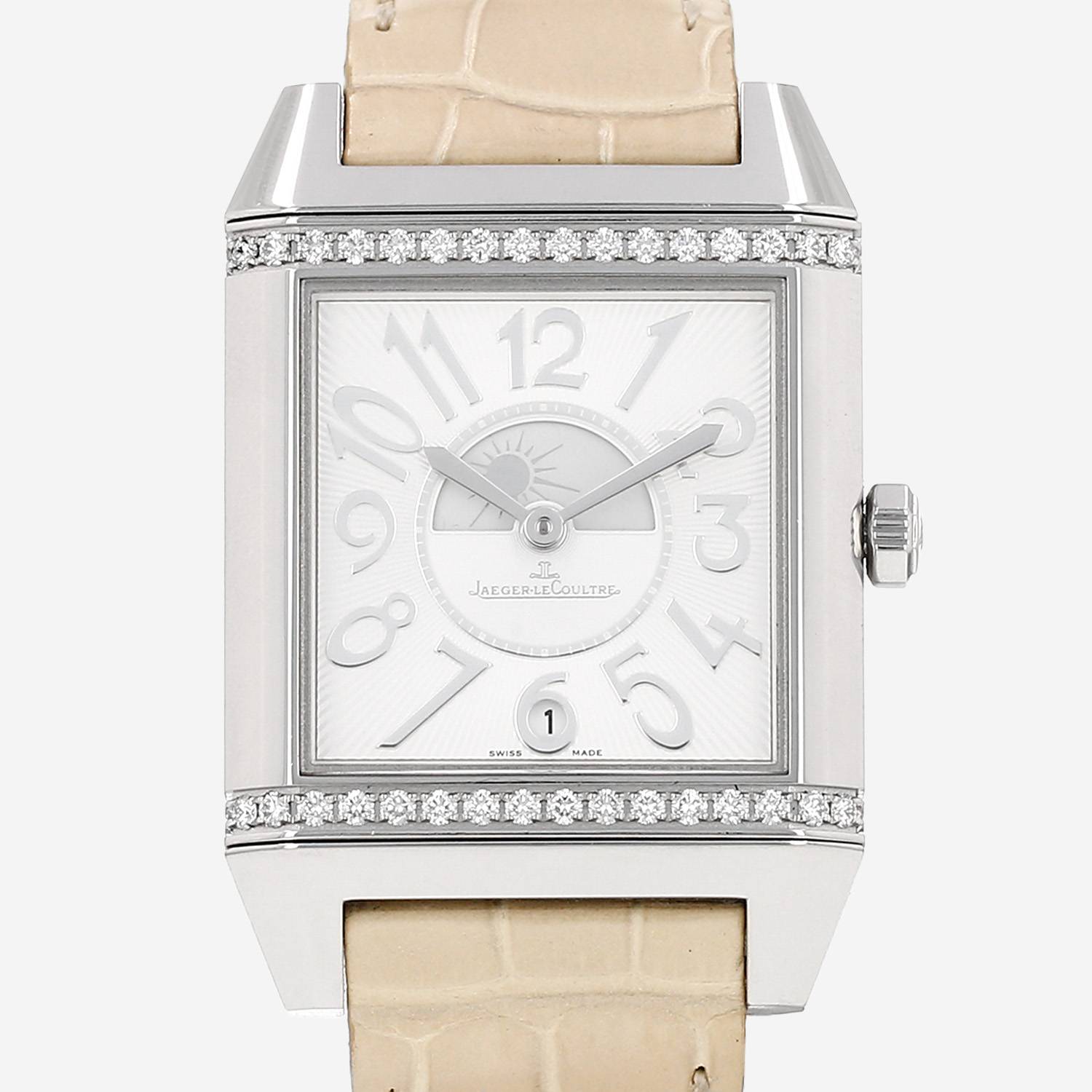 - Cinturino in pelle color crema firmato Jaeger LeCoultre, doppia chiusura a scomparsa in acciaio firmata Jaeger LeCoultre.