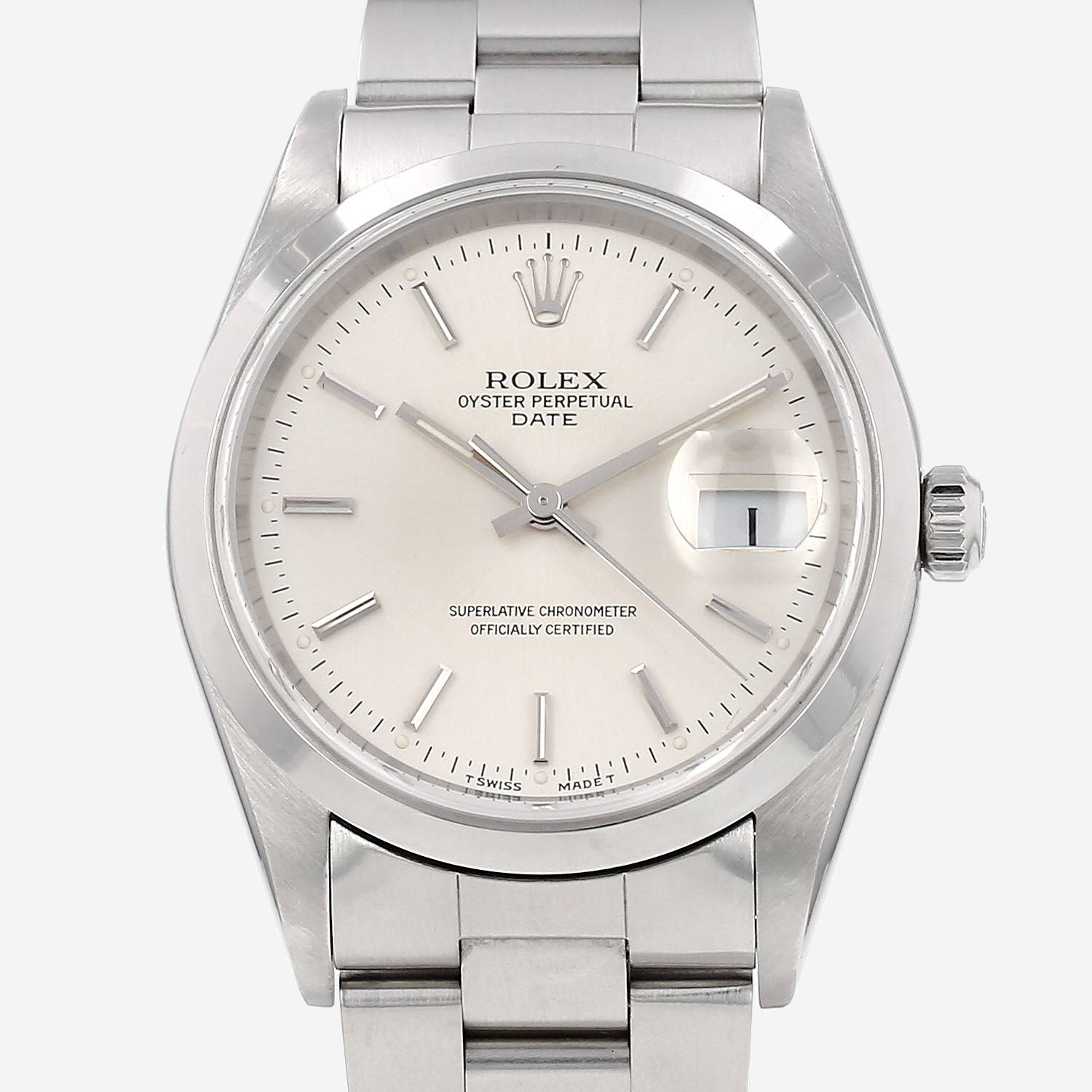 Orologio da polso Rolex Oyster Perpetual Date in acciaio. Cassa rotonda in acciaio, fondo cassa avvitato, lunetta liscia, corona a vite.