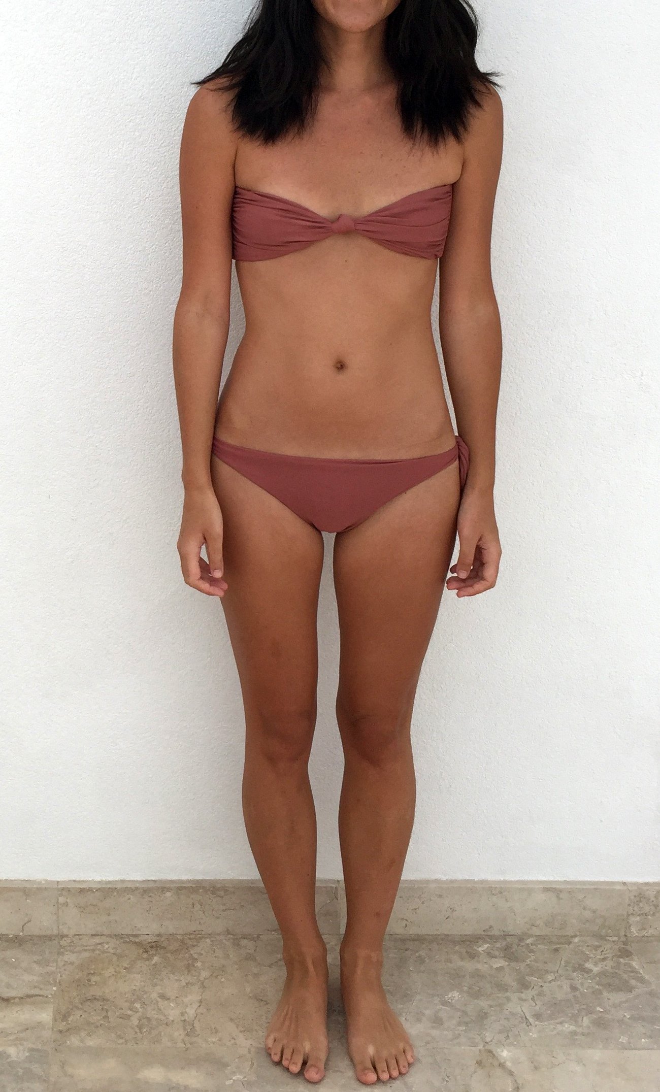 Carmel top: It is a gorgeous top. It’s an extra-small because I wanted a little more lift. I have it in a size up and it still looks good… But a size up also slips more easily and doesn’t hug things together as much… In either size, I love how this top looks though. You will want to twist the back so that the knot comes out on top though and doesn’t dig into your chest. Such a beautiful bandeau Mikoh bikini top!