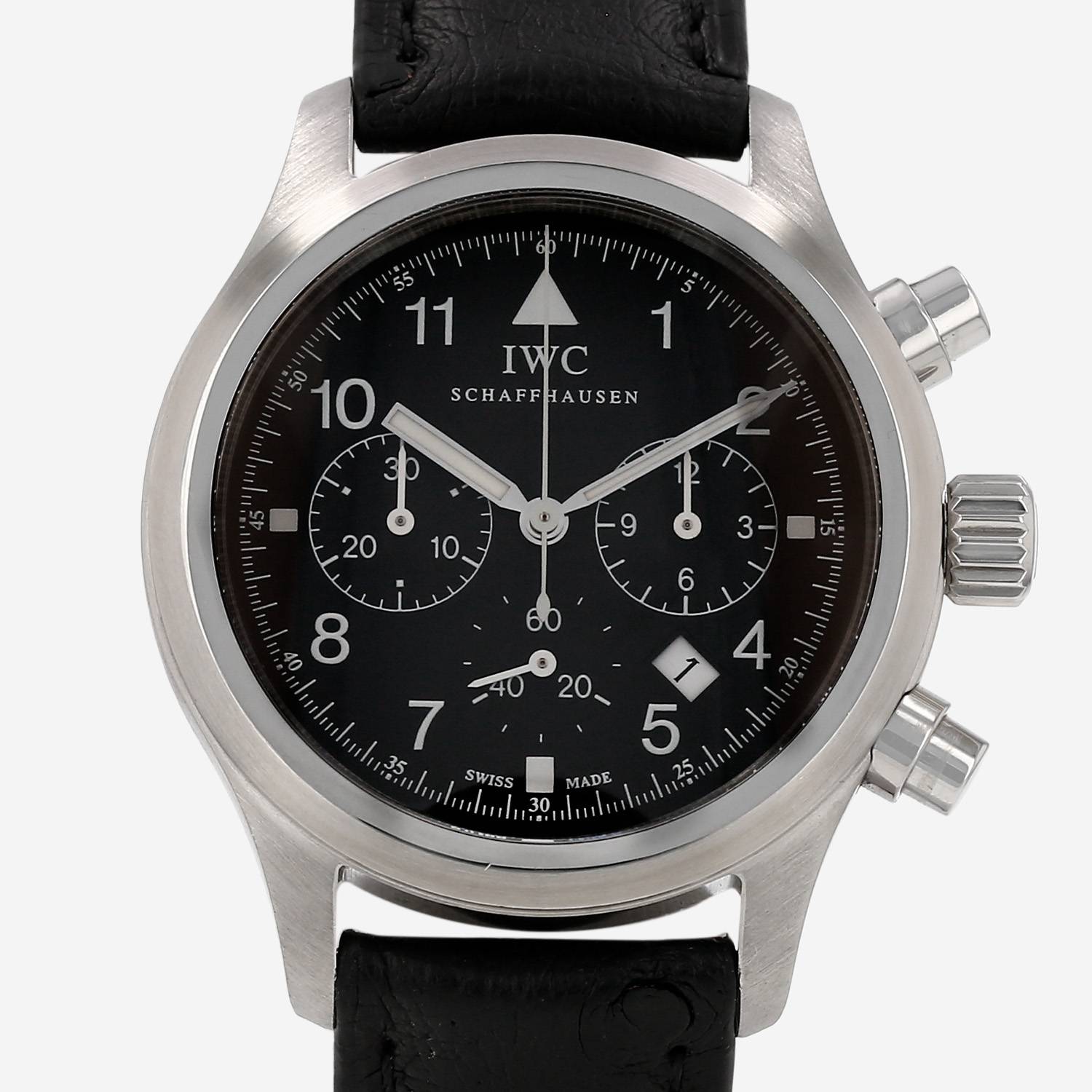 Montre bracelet IWC Pilot's Watches Chronograph en acier. Boitier rond en acier, fond vissé, poussoirs pompes, à 2h et 4h, couronne vissée.