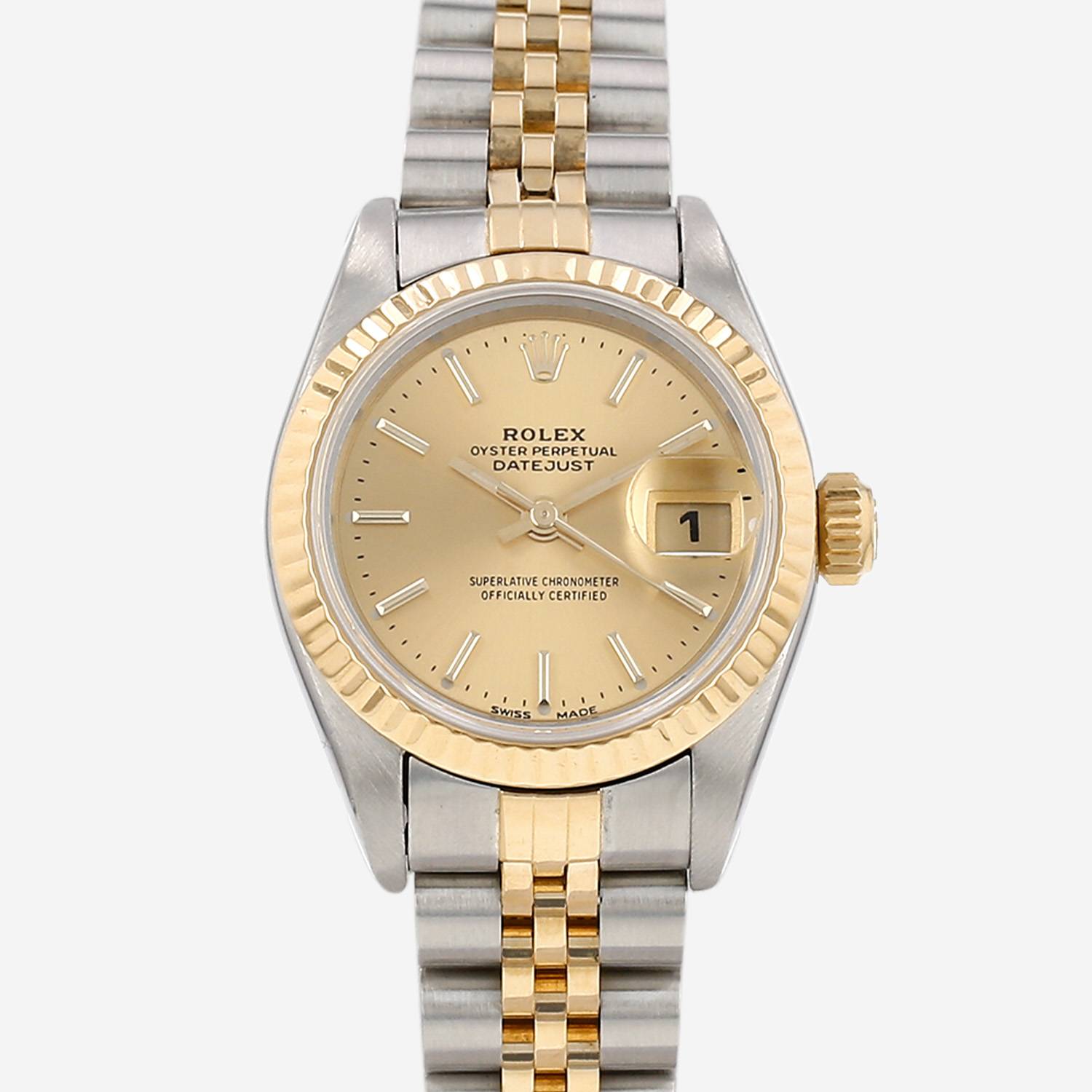 Montre bracelet Rolex Datejust Lady en or et acier. Boitier rond en or et acier, fond vissé, lunette striée en or jaune, couronne vissée.