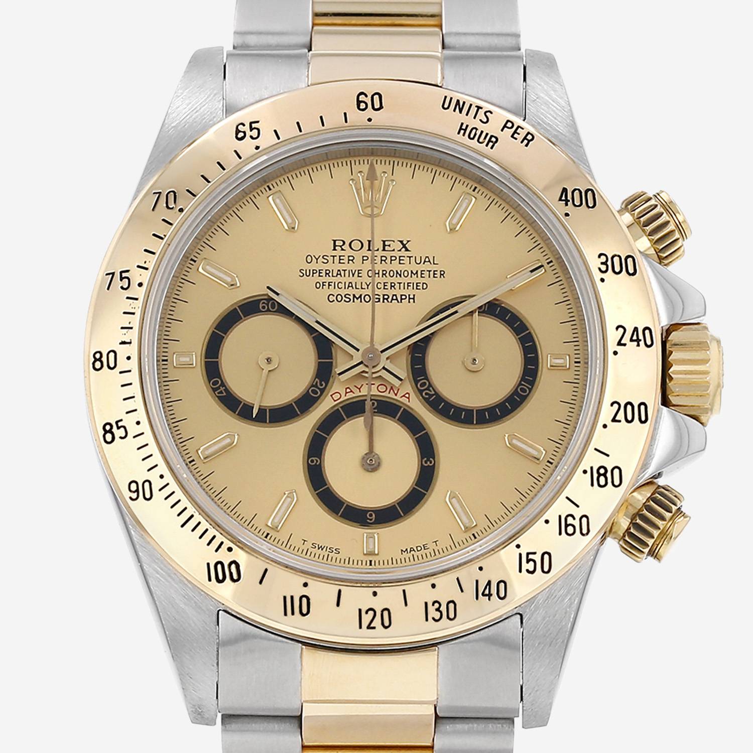 Montre bracelet Rolex Daytona Automatique en or et acier. Boitier rond en or et acier, fond vissé, poussoirs vissés, à 2h et 4h, lunette graduée échelle tachymétrique en or jaune, couronne vissée.