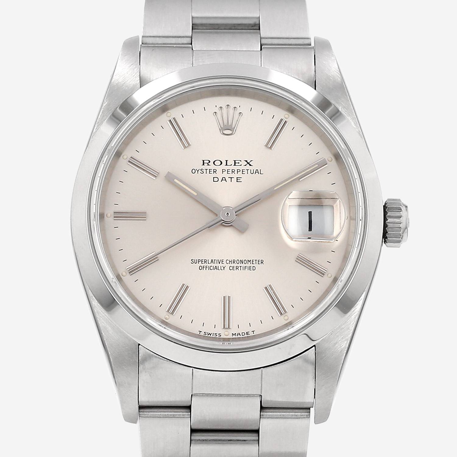 Montre bracelet Rolex Oyster Perpetual Date en acier. Boitier rond en acier, fond vissé, lunette lisse, couronne vissée.
