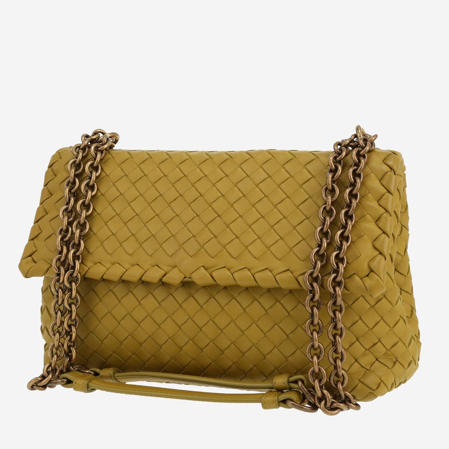 Pratique sac bandoulière Bottega Veneta Olimpia en cuir intrecciato vert, garniture en métal doré, une anse-chaine transformable en métal doré permettant un porté main ou épaule ou bandoulière.