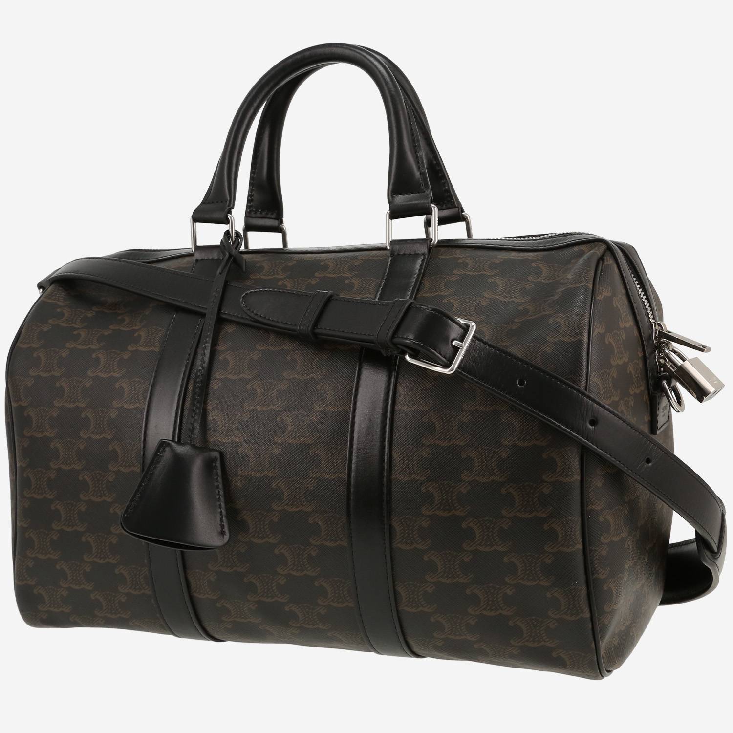 Incontournable sac à main Celine Boston en toile Triomphe marron et cuir noir, garniture en métal argenté, double poignée en cuir noir, anse bandoulière amovible réglable en cuir noir permettant un porté main ou épaule ou bandoulière.