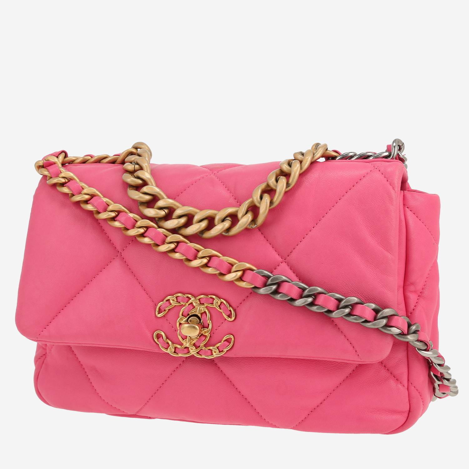 Charmant sac bandoulière Chanel 19 en cuir matelassé rose, garniture en métal doré et argenté, poignée simple en métal doré, une anse-chaine en métal doré et argenté entrelacée de cuir rose permettant un porté main ou épaule ou bandoulière.