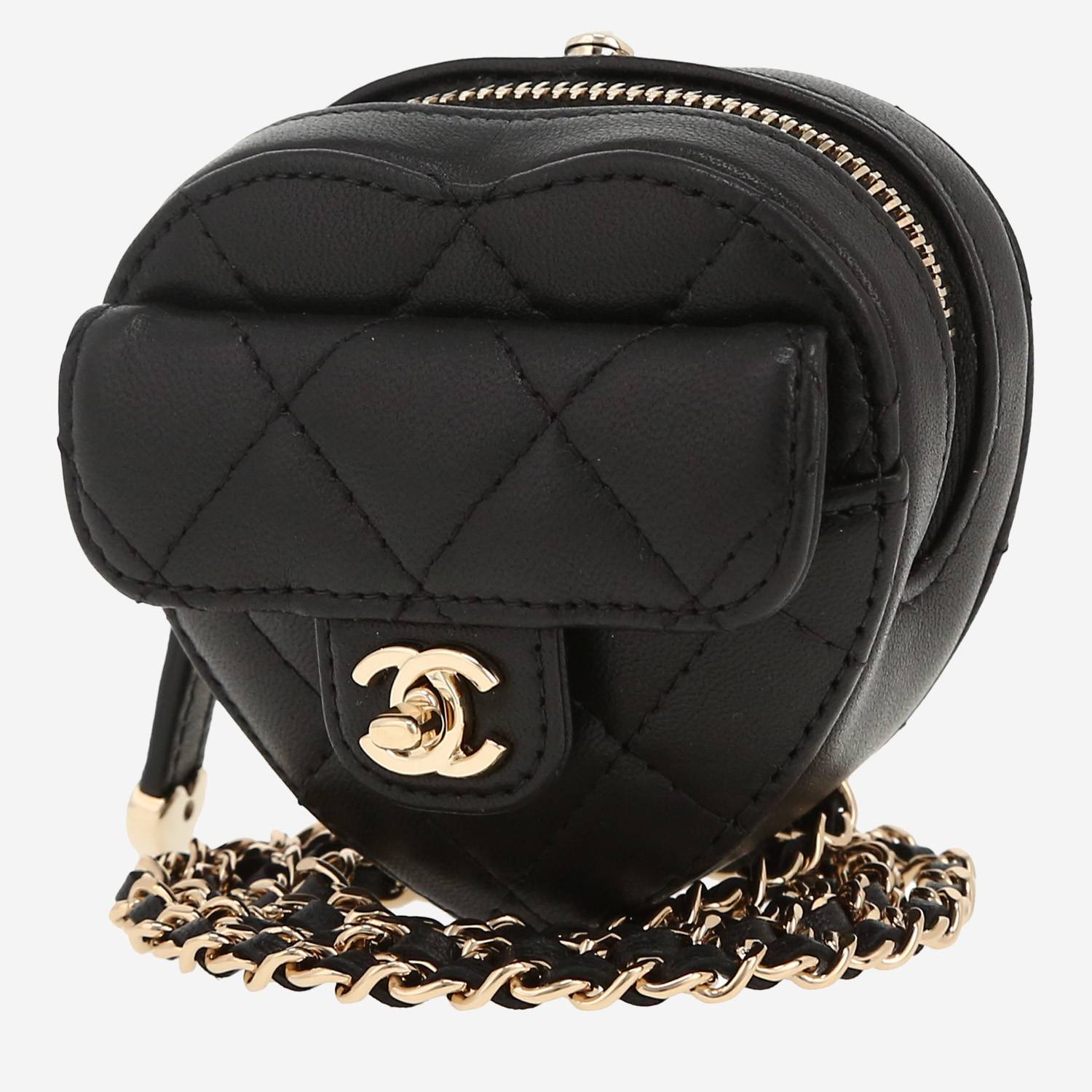 Amusant sac bandoulière Chanel Heart bag mini en cuir matelassé noir, garniture en métal doré, une anse-chaine en métal doré entrelacée de cuir noir.