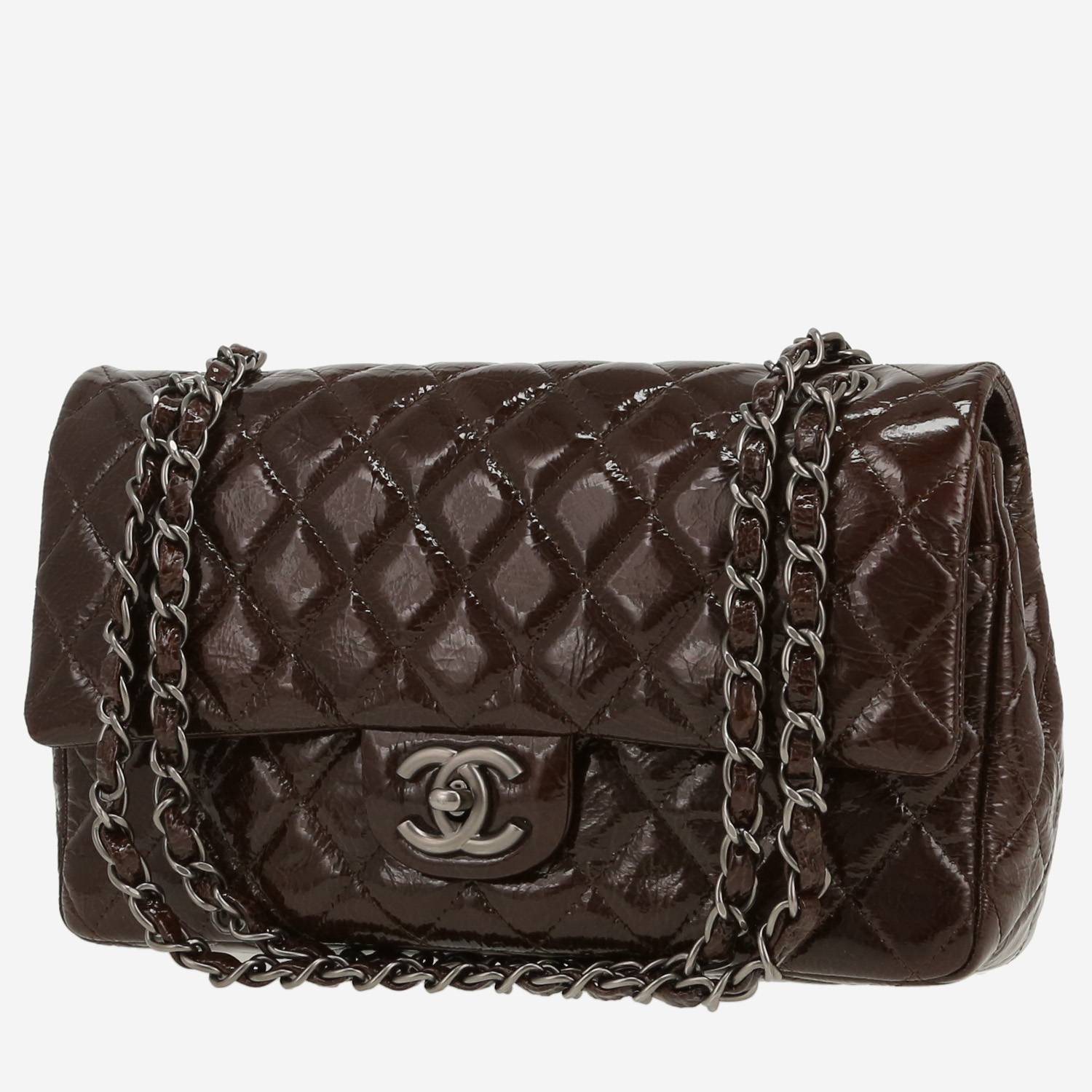 Magnifique sac à main Chanel Timeless Classic en cuir verni matelassé marron, garniture en métal argenté noirci, une anse-chaine transformable en métal argenté noirci entrelacée de cuir verni marron permettant un porté main ou épaule.