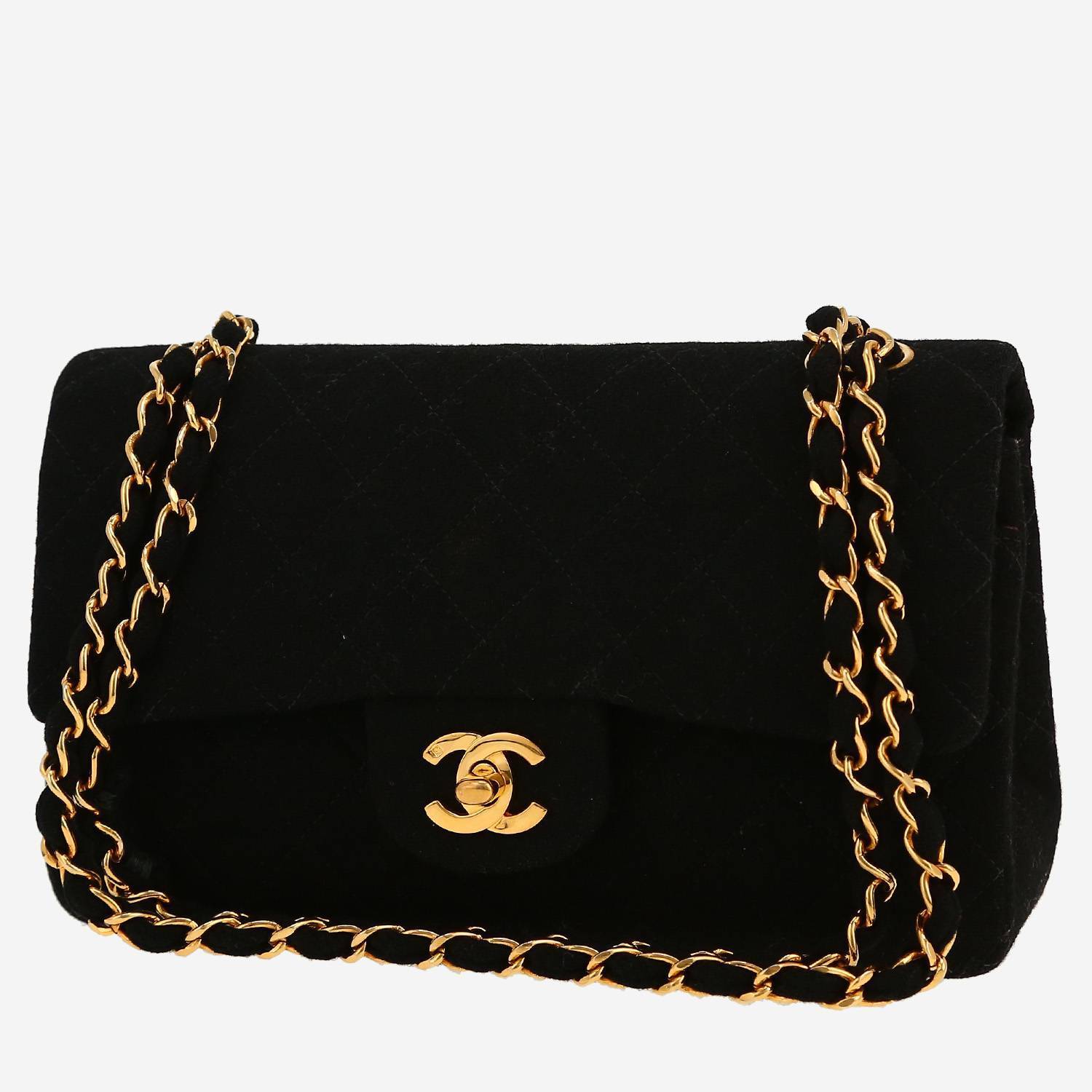Joli sac à main Chanel Timeless Classic en toile de laine noir, garniture en métal doré, une anse-chaine en métal doré entrelacée de toile noire permettant un porté main ou épaule.