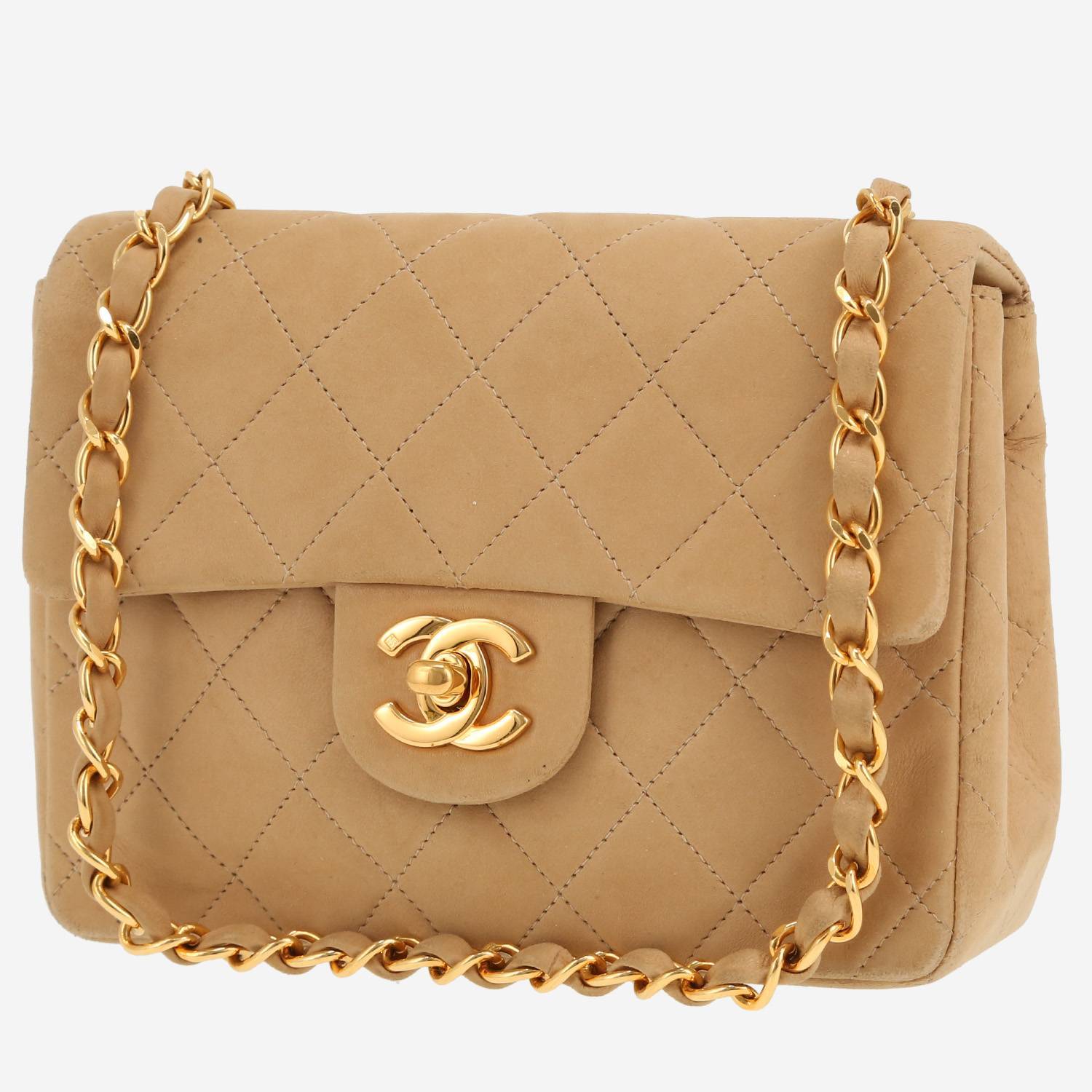 Élégant sac bandoulière Chanel Mini Timeless en Veau velours beige, garniture en métal doré, anse-chaine en métal doré entrelacée de Veau velours beige permettant un porté main ou épaule ou bandoulière.
