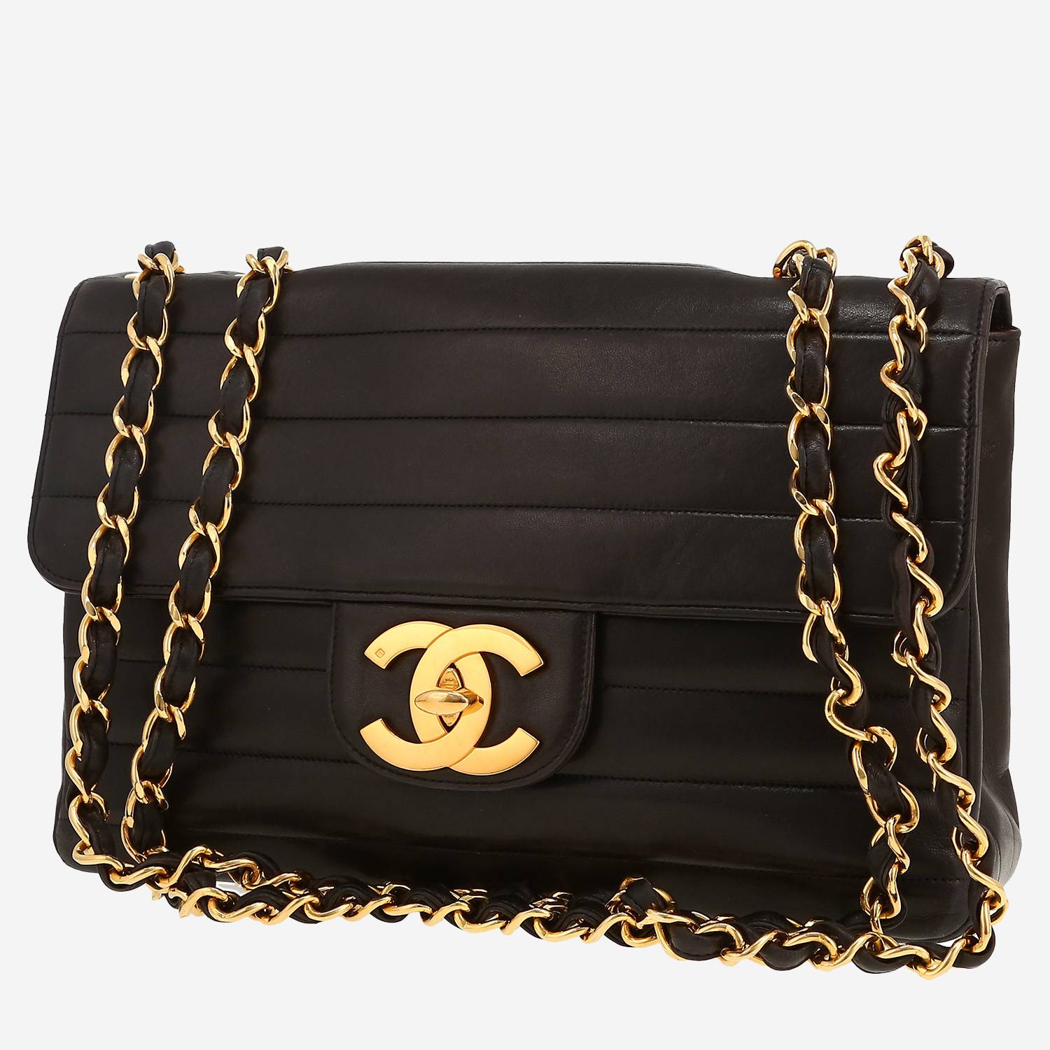 Splendide sac bandoulière Chanel Timeless Jumbo en cuir matelassé noir, garniture en métal doré, une anse-chaine en métal doré entrelacée de cuir noir permettant un porté main ou épaule ou bandoulière.