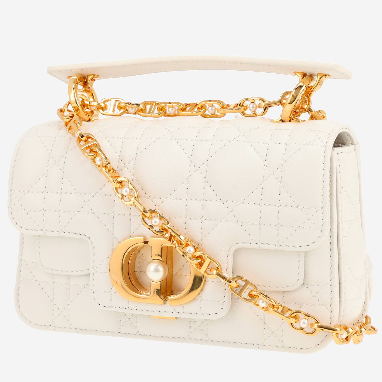 Ravissant sac à main Dior Top Handle Dior Jolie mini en cuir cannage blanc, garniture en métal doré, poignée simple en cuir blanc, une anse-chaine amovible en métal doré permettant un porté main ou épaule ou bandoulière.