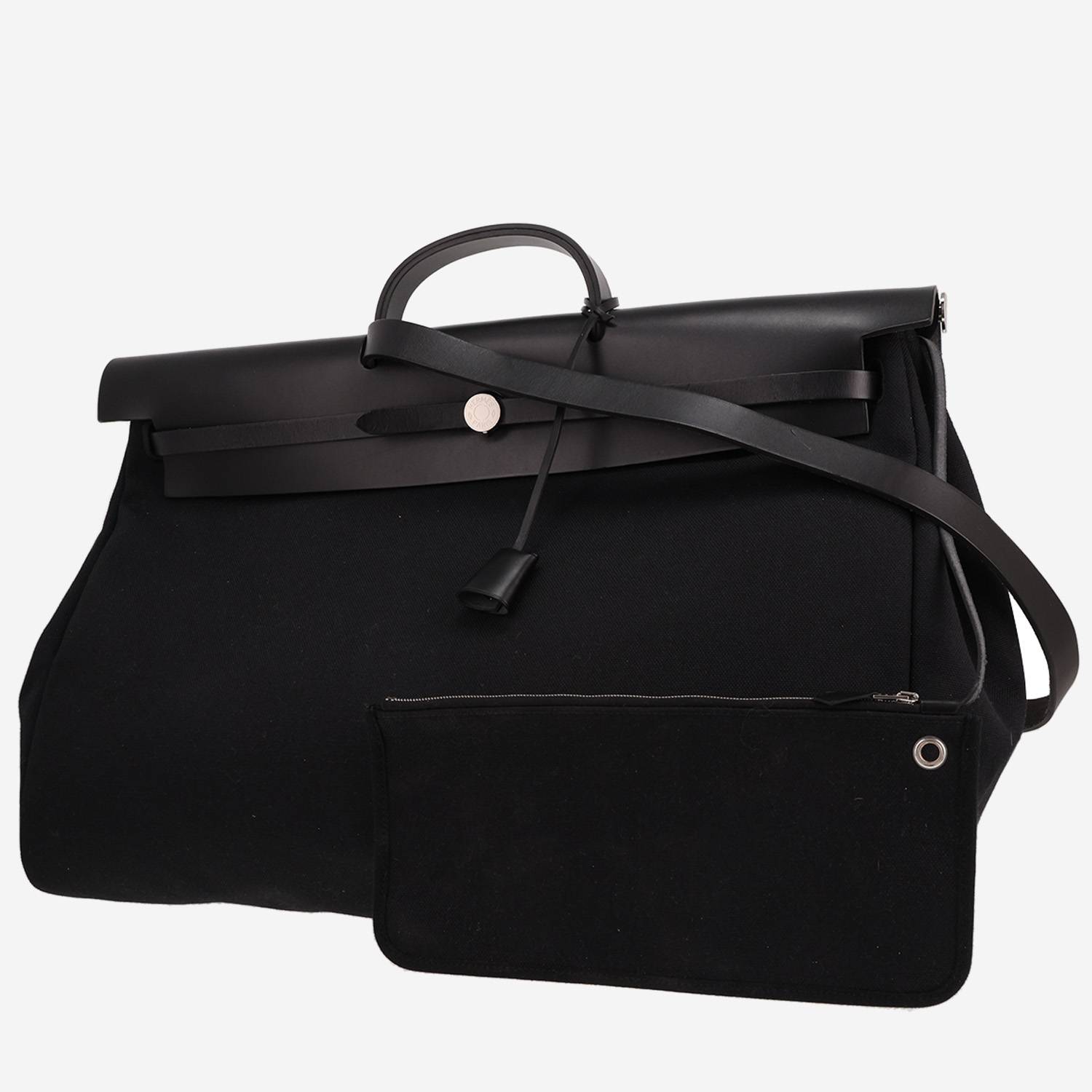 Pratique sac de voyage Hermès Herbag en toile noir et cuir noir, garniture en métal palladié, poignée simple en cuir noir, anse bandoulière amovible en cuir noir permettant un porté main ou épaule.