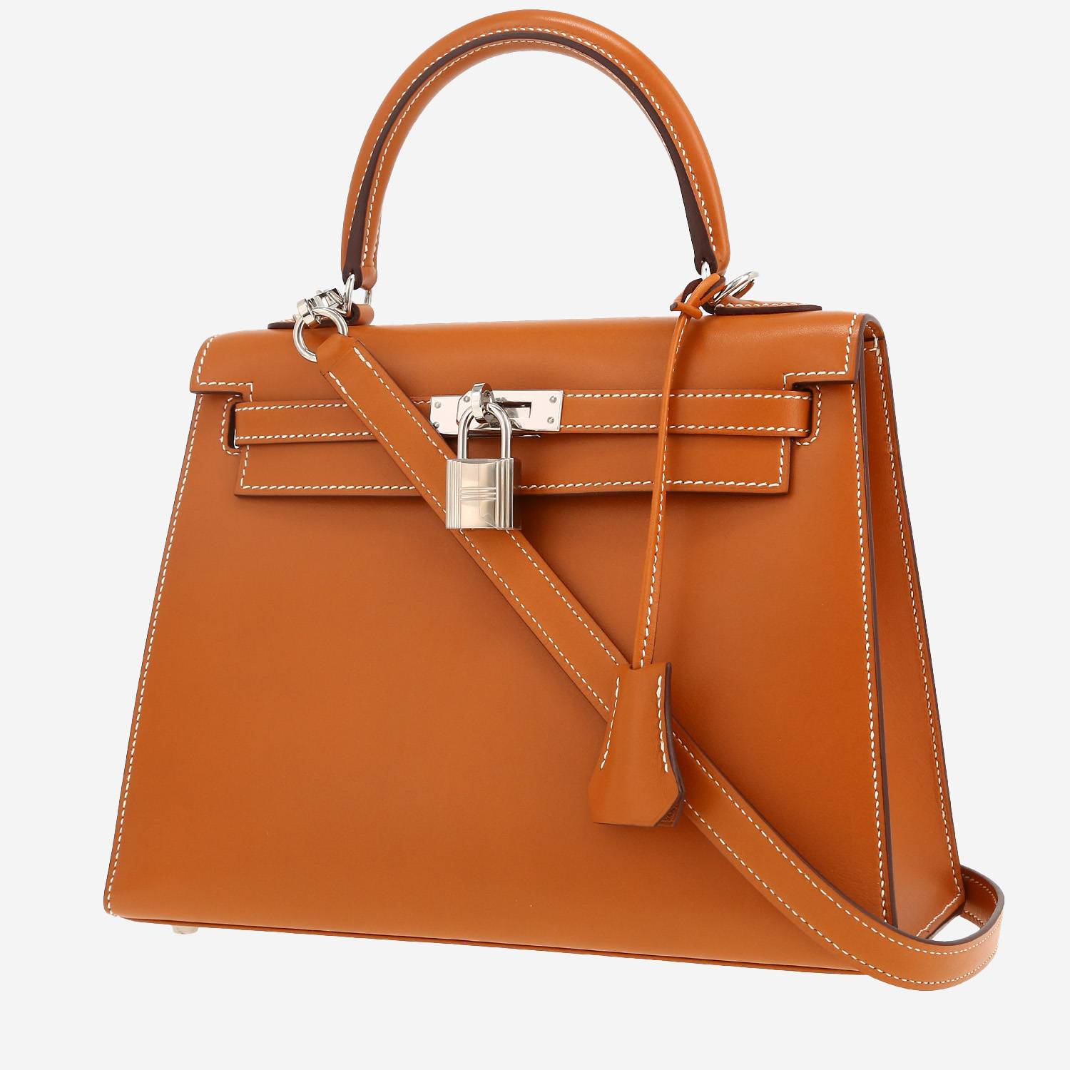Exceptionnel sac à main Hermes Kelly 25 cm en cuir box gold, garniture en métal palladié, poignée simple en cuir box gold, une anse simple amovible en cuir box gold permettant un porté main ou épaule.