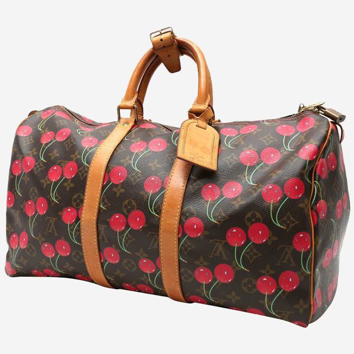 Chic sac de week end Louis Vuitton x x Takashi Murakami Keepall 45 Editions Limitées en toile monogram décorée de cerises dessinées par l'artiste Takashi Murakami et cuir naturel, garniture en métal doré, double poignée en cuir naturel permettant un porté main.